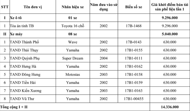 * Giá khởi điểm bán tài sản phế liệu lần 1 là: 14.336.000 đồng (Mười bốn triệu ba trăm ba mươi sáu nghìn đồng).