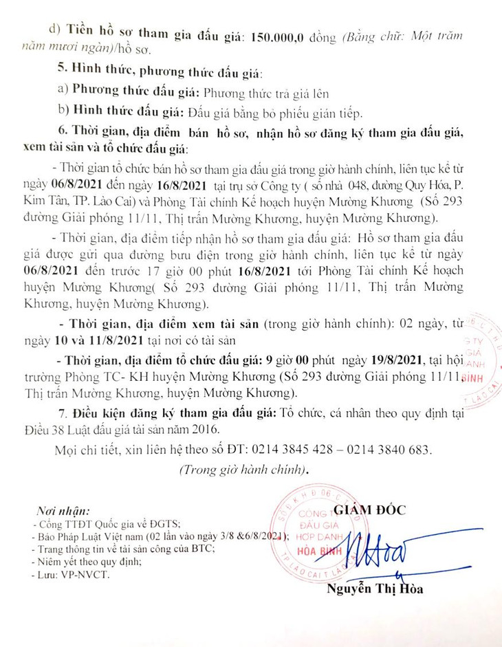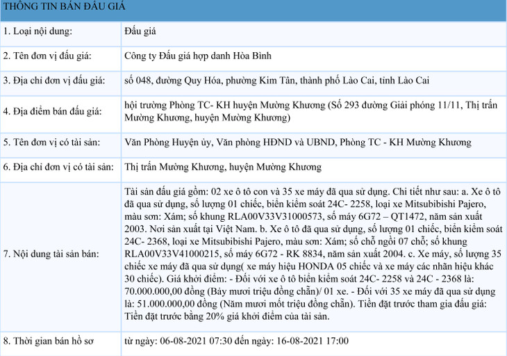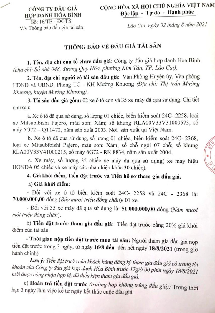 (BĐT) - Công ty Đấu giá hợp danh Hòa Bình thông báo đấu giá 2 xe ô tô con và 35 xe máy đã qua sử dụng vào ngày 19/8/2021 do Văn phòng Huyện ủy, Văn phòng HĐND và UBND, Phòng TC - KH Mường Khương ủy quyền như sau: