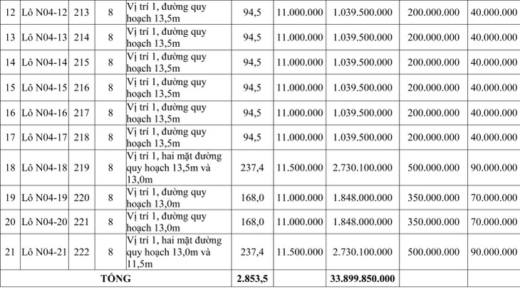 Ghi chú: Giá đất khởi điểm nêu trên chưa bao gồm lệ phí trước bạ về đất và các khoản phí, lệ phí khác theo quy định.