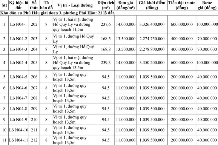 1. Danh mục số lượng lô đất đấu giá, giá khởi điểm, tiền đặt trước, bước giá: