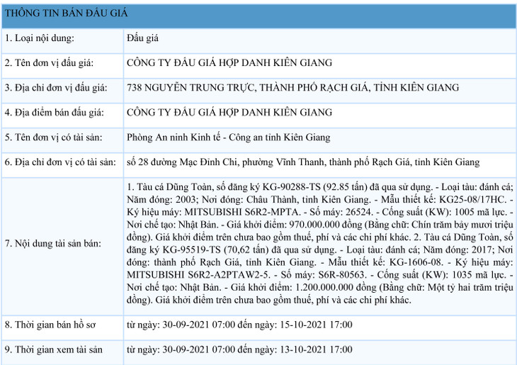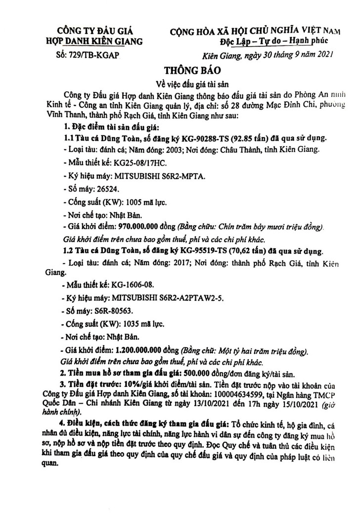 1. Tàu cá Dũng Toàn, số đăng ký KG-90288-TS (92.85 tấn) đã qua sử dụng. - Loại tàu: đánh cá; Năm đóng: 2003; Nơi đóng: Châu Thành, tỉnh Kiên Giang. - Mẫu thiết kế: KG25-08/17HC. - Ký hiệu máy: MITSUBISHI S6R2-MPTA. - Số máy: 26524. - Cống suất (KW): 1005 mã lực. - Nơi chế tạo: Nhật Bản. - Giá khởi điểm: 970.000.000 đồng (Bằng chữ: Chín trăm bảy mươi triệu đồng). Giá khởi điểm trên chưa bao gồm thuế, phí và các chi phí khác. 2. Tàu cá Dũng Toàn, số đăng ký KG-95519-TS (70,62 tấn) đã qua sử dụng. - Loại tàu: đánh cá; Năm đóng: 2017; Nơi đóng: thành phố Rạch Giá, tỉnh Kiên Giang. - Mẫu thiết kế: KG-1606-08. - Ký hiệu máy: MITSUBISHI S6R2-A2PTAW2-5. - Số máy: S6R-80563. - Cống suất (KW): 1035 mã lực. - Nơi chế tạo: Nhật Bản. - Giá khởi điểm: 1.200.000.000 đồng (Bằng chữ: Một tỷ hai trăm triệu đồng). Giá khởi điểm trên chưa bao gồm thuế, phí và các chi phí khác.