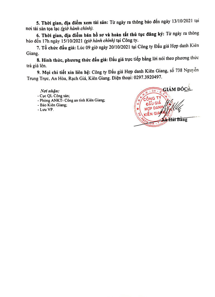 (BĐT) - Công ty Đấu giá hợp danh Kiên Giang thông báo đấu giá tài sản vào ngày 20/10/2021 do Phòng An ninh Kinh tế - Công an tỉnh Kiên Giang ủy quyền như sau: