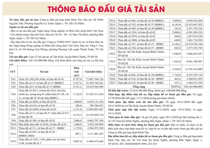 (BĐT) - Công ty Đấu giá Hợp danh Đỉnh Tân thông báo đấu giá tài sản vào ngày 20/11/2020 do Ngân hàng Agribank Chi nhánh Trung tâm Sài Gòn và Công ty TNHH MTV Quản lý nợ và Khai thác tài sản Agribank ủy quyền như sau:
