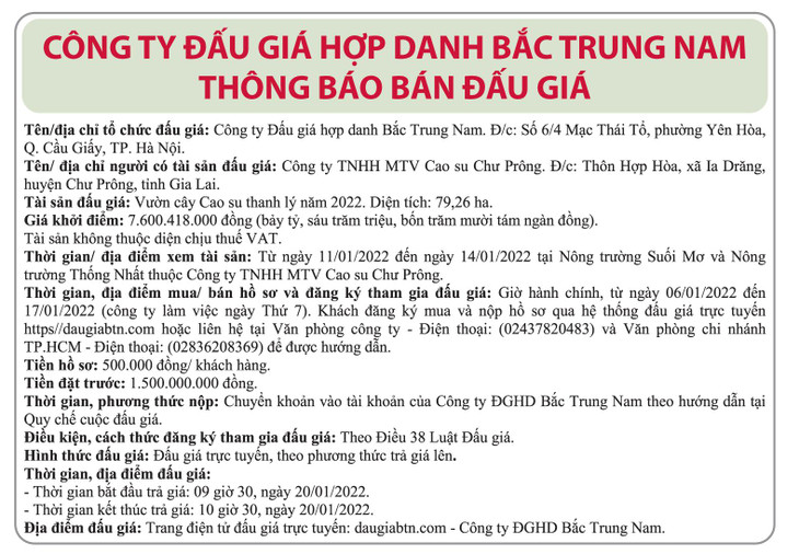 (BĐT) - Công ty Đấu giá hợp danh Bắc Trung Nam thông báo đấu giá tài sản vào ngày 20/1/2022 do Công ty TNHH MTV Cao su Chư Prông ủy quyền như sau: