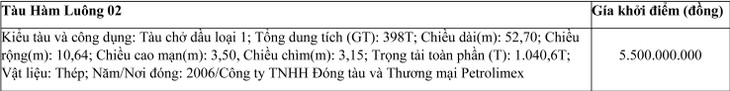 * Ghi chú: Giá trên đã bao gồm thuế GTGT và không bao gồm giá trị nhiên liệu còn tồn trên tàu tại thời điểm bàn giao. Mọi chi phí liên quan đến việc di dời, sử dụng tài sản và chuyển quyền sở hữu, thuế chuyển nhượng, phí công chứng, phí trước bạ, phí thuế khác...(nếu có) sẽ do khách hàng trúng đấu giá chịu.
