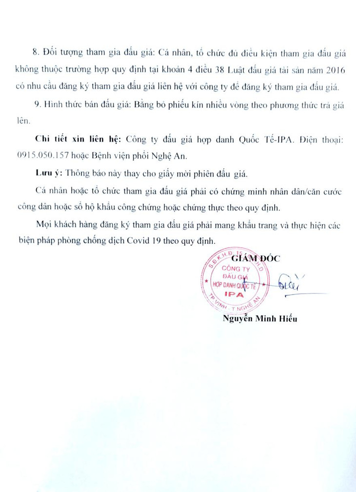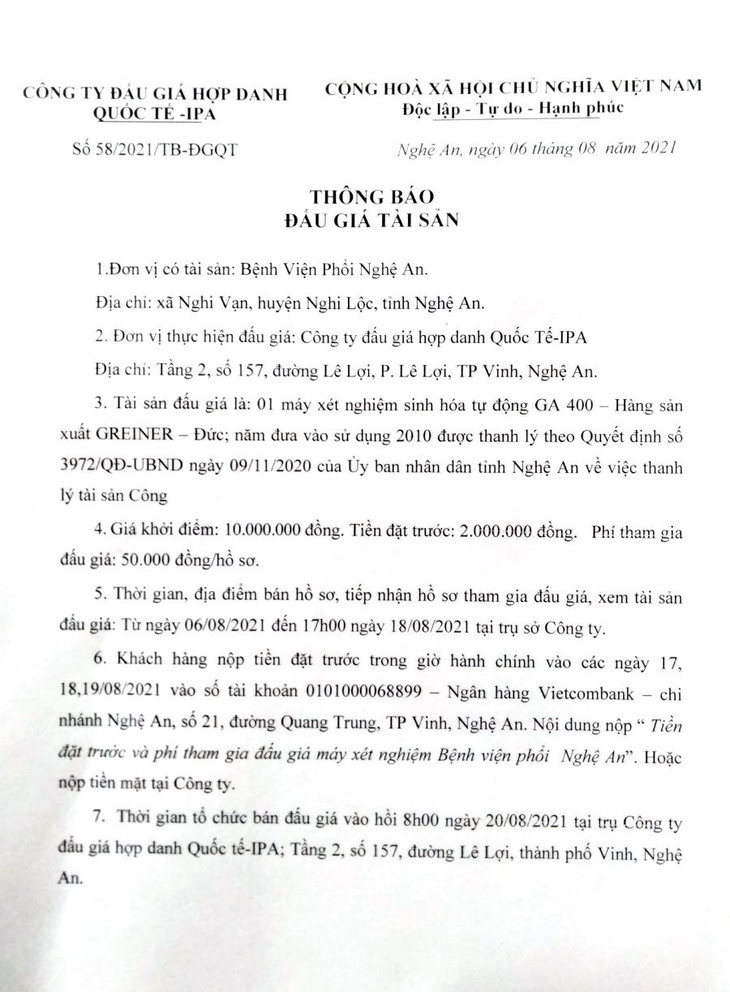 01 máy xét nghiệm sinh hóa tự động GA 400 – Hàng sản xuất GREINER – Đức; năm đưa vào sử dụng 2010 được thanh lý theo Quyết định số 3972/QĐ-UBND ngày 09/11/2020 của Ủy ban nhân dân tỉnh Nghệ An về việc thanh lý tài sản Công