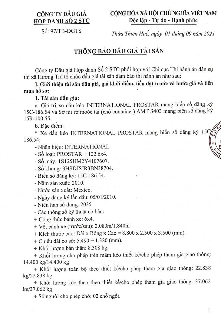 Xe đầu kéo INTERNATIONAL PROSTAR mang biển số đăng ký 15C-186.54 và Sơ mi rơ moóc tải (chở container) AMT S403 mang biển số đăng ký 15R-100.55.