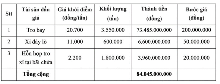 1. Tài sản đấu giá: Khối lượng tro bay, xỉ đáy lò và hỗn hợp tro xỉ tại bãi chứa dự kiến hình thành trong quá trình sản xuất điện của Nhà máy Nhiệt điện Vũng Áng 1 trong thời gian 5 năm (tháng 1/2025 đến tháng 1/2030)