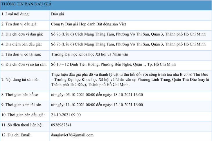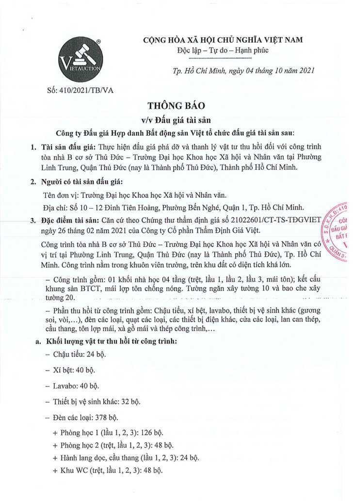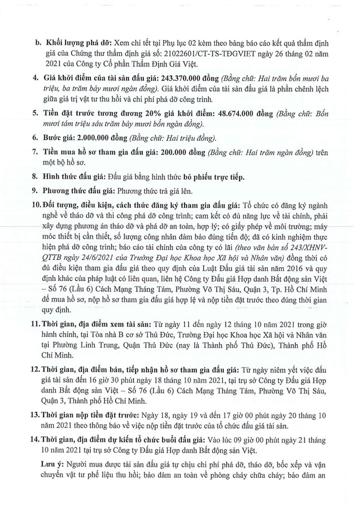 Thực hiện đấu giá phá dỡ và thanh lý vật tư thu hồi đối với công trình tòa nhà B cơ sở Thủ Đức – Trường Đại học Khoa học Xã hội và Nhân văn tại Phường Linh Trung, Quận Thủ Đức (nay là Thành phố Thủ Đức), Thành phố Hồ Chí Minh.