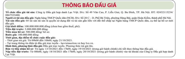 (BĐT) - Công ty Đấu giá hợp danh Lạc Việt thông báo đấu giá tài sản vào ngày 21/10/2021 do NCB ủy quyền như sau: