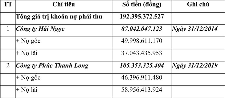 > Giá trị khoản nợ tại Công ty Phúc Thanh Long: Ghi nhận theo biên bản xác nhận công nợ thời điểm 31/12/2019 giữa DATC và Bên được uỷ quyền là Công ty Cổ phần Phúc Long.