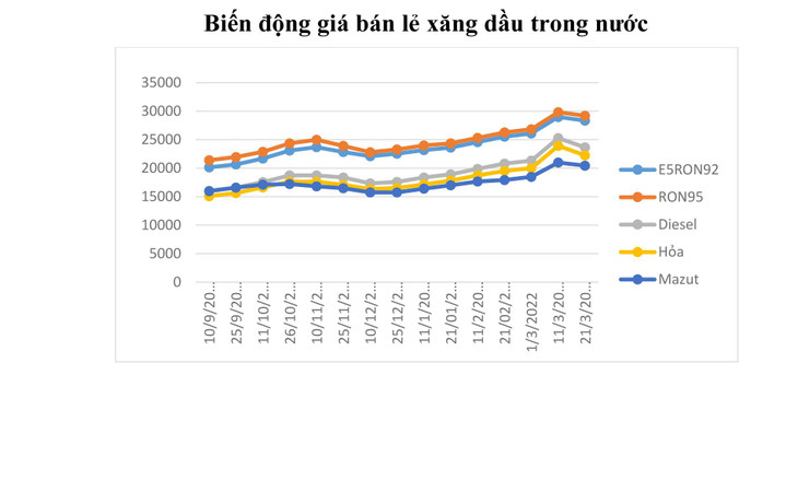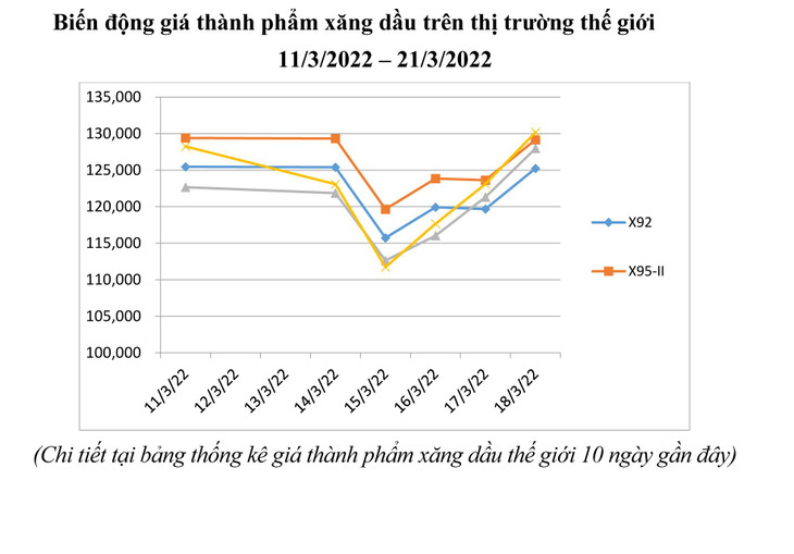 Bình quân giá thành phẩm xăng dầu thế giới giữa kỳ điều hành giá xăng dầu ngày 11/3/2022 và kỳ điều hành ngày 21/3/2022 là: 121,912 USD/thùng xăng RON92 dùng để pha chế xăng E5 RON 92 (giảm 10,340 USD/thùng, tương đương giảm 7,82% so với kỳ trước); 125,842 USD/thùng xăng RON 95 (giảm 9,908 USD/thùng, tương đương giảm 7,30% so với kỳ trước); 120,408 USD/thùng dầu hỏa (giảm 14,840 USD/thùng, tương đương giảm 10,97% so với kỳ trước); 122,338 USD/thùng dầu diesel (giảm 22,853 USD/thùng, tương đương giảm 15,74% so với kỳ trước); 625,090 USD/tấn dầu mazut 180CST 3,5S (giảm 22,757 USD/tấn, tương đương giảm 3,51% so với kỳ trước).