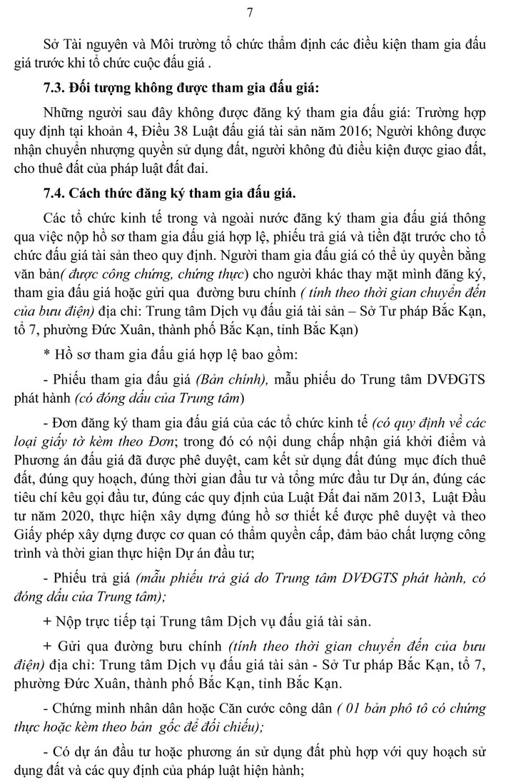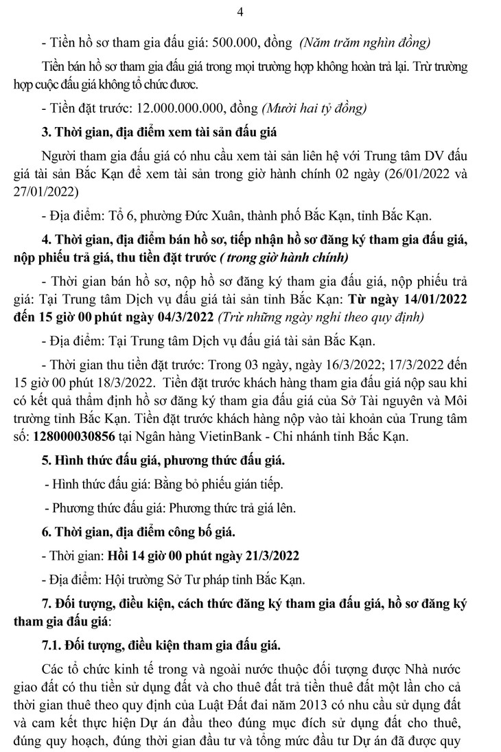 Điều kiện, cách thức đăng ký tham gia đấu giá: Chi tiết theo thông báo số 05/TB-TTDVĐGTS ngày 14/01/2022 của Trung tâm Dịch vụ đấu giá tài sản, Sở Tư pháp tỉnh Bắc Kạn