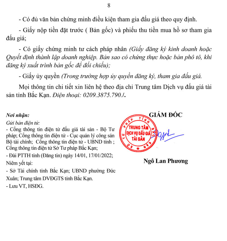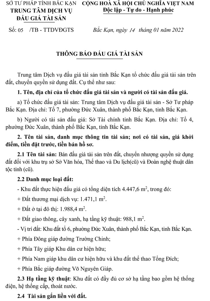 Tổ chức đấu giá tài sản: Trung tâm Dịch vụ đấu giá tài sản tỉnh Bắc Kạn