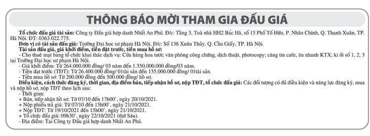 (BĐT) - Công ty Đấu giá hợp danh Nhất An Phú thông báo đấu giá tài sản vào ngày 22/10/2021 do Trường Đại học Sư phạm Hà Nội ủy quyền như sau: