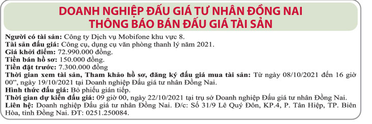 (BĐT) - Doanh nghiệp Đấu giá tư nhân Đồng Nai thông báo đấu giá tài sản vào ngày 22/10/2021 do VIB ủy quyền như sau:
