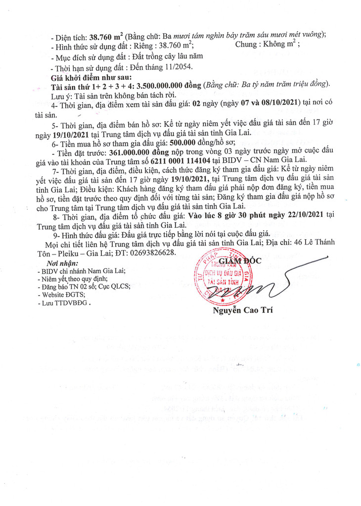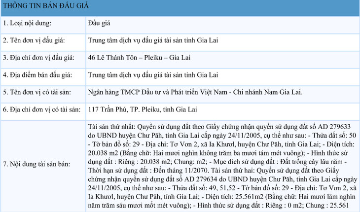 (BĐT) - Trung tâm Dịch vụ đấu giá tài sản tỉnh Gia Lai thông báo đấu giá tài sản vào ngày 22/10/2021 do Ngân hàng TMCP Đầu tư và Phát triển Việt Nam - Chi nhánh Nam Gia Lai ủy quyền như sau: