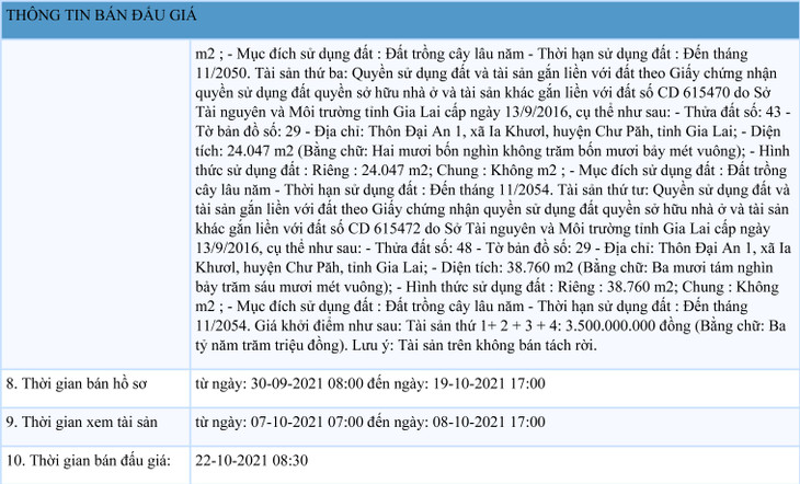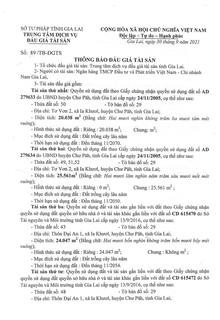 Tài sản thứ nhất: Quyền sử dụng đất theo Giấy chứng nhận quyền sử dụng đất số AD 279633 do UBND huyện Chư Păh, tỉnh Gia Lai cấp ngày 24/11/2005, cụ thể như sau: - Thửa đất số: 50 - Tờ bản đồ số: 29 - Địa chỉ: Tơ Vơn 2, xã Ia Khươl, huyện Chư Păh, tỉnh Gia Lai; - Diện tích: 20.038 m2 (Bằng chữ: Hai mươi nghìn không trăm ba mươi tám mét vuông); - Hình thức sử dụng đất : Riêng : 20.038 m2; Chung: m2; - Mục đích sử dụng đất : Đất trồng cây lâu năm - Thời hạn sử dụng đất : Đến tháng 11/2070. Tài sản thứ hai: Quyền sử dụng đất theo Giấy chứng nhận quyền sử dụng đất số AD 279634 do UBND huyện Chư Păh, tỉnh Gia Lai cấp ngày 24/11/2005, cụ thể như sau: - Thửa đất số: 49, 51,52 - Tờ bản đồ số: 29 - Địa chỉ: Tơ Vơn 2, xã Ia Khươl, huyện Chư Păh, tỉnh Gia Lai; - Diện tích: 25.561m2 (Bằng chữ: Hai mươi lăm nghìn năm trăm sáu mươi mốt mét vuông); - Hình thức sử dụng đất : Riêng : 0 m2; Chung : 25.561 m2 ; - Mục đích sử dụng đất : Đất trồng cây lâu năm - Thời hạn sử dụng đất : Đến tháng 11/2050. Tài sản thứ ba: Quyền sử dụng đất và tài sản gắn liền với đất theo Giấy chứng nhận quyền sử dụng đất quyền sở hữu nhà ở và tài sản khác gắn liền với đất số CD 615470 do Sở Tài nguyên và Môi trường tỉnh Gia Lai cấp ngày 13/9/2016, cụ thể như sau: - Thửa đất số: 43 - Tờ bản đồ số: 29 - Địa chỉ: Thôn Đại An 1, xã Ia Khươl, huyện Chư Păh, tỉnh Gia Lai; - Diện tích: 24.047 m2 (Bằng chữ: Hai mươi bốn nghìn không trăm bốn mươi bảy mét vuông); - Hình thức sử dụng đất : Riêng : 24.047 m2; Chung : Không m2 ; - Mục đích sử dụng đất : Đất trồng cây lâu năm - Thời hạn sử dụng đất : Đến tháng 11/2054. Tài sản thứ tư: Quyền sử dụng đất và tài sản gắn liền với đất theo Giấy chứng nhận quyền sử dụng đất quyền sở hữu nhà ở và tài sản khác gắn liền với đất số CD 615472 do Sở Tài nguyên và Môi trường tỉnh Gia Lai cấp ngày 13/9/2016, cụ thể như sau: - Thửa đất số: 48 - Tờ bản đồ số: 29 - Địa chỉ: Thôn Đại An 1, xã Ia Khươl, huyện Chư Păh, tỉnh Gia Lai; - Diện tích: 38.760 m2 (Bằng chữ: Ba mươi tám nghìn bảy trăm sáu mươi mét vuông); - Hình thức sử dụng đất : Riêng : 38.760 m2; Chung : Không m2 ; - Mục đích sử dụng đất : Đất trồng cây lâu năm - Thời hạn sử dụng đất : Đến tháng 11/2054. Giá khởi điểm như sau: Tài sản thứ 1+ 2 + 3 + 4: 3.500.000.000 đồng (Bằng chữ: Ba tỷ năm trăm triệu đồng). Lưu ý: Tài sản trên không bán tách rời.