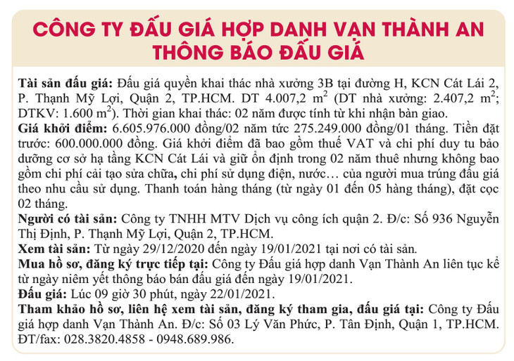 (BĐT) - Công ty Đấu giá hợp danh Vạn Thành An thông báo đấu giá tài sản vào ngày 22/1/2021 do Công ty TNHH MTV Dịch vụ công ích Quận 2 ủy quyền như sau: