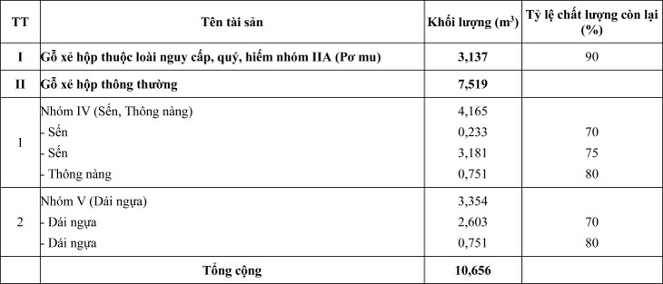 3.1 Tài sản đấu giá là tang vật vi phạm hành chính bị tịch thu sung quỹ nhà nước là 10,656 m3 gỗ xẻ hộp các loại. Đặc điểm của tài sản: