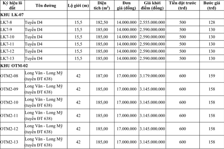- Phương thức đấu giá: Trả giá lên; đấu giá riêng từng lô đất.