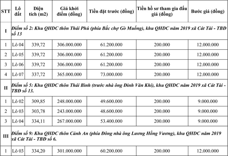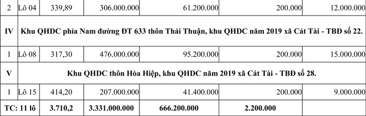 BẢNG KÊ CHI TIẾT ĐẤU GIÁ QSD ĐẤT Ở XÃ CÁT TÀI, HUYỆN PHÙ CÁT, TỈNH BÌNH ĐỊNH
