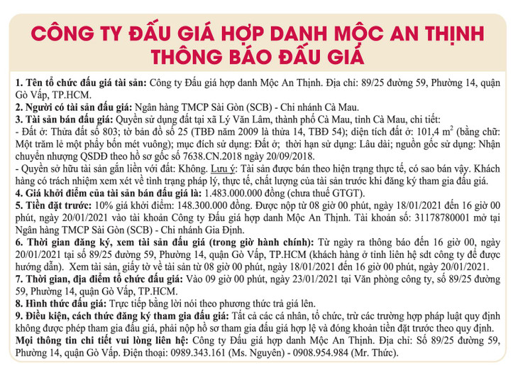 (BĐT) - Công ty Đấu giá hợp danh Mộc An Thịnh thông báo đấu giá tài sản vào ngày 23/1/2021 do Ngân hàng SCB Chi nhánh Cà Mau ủy quyền như sau: