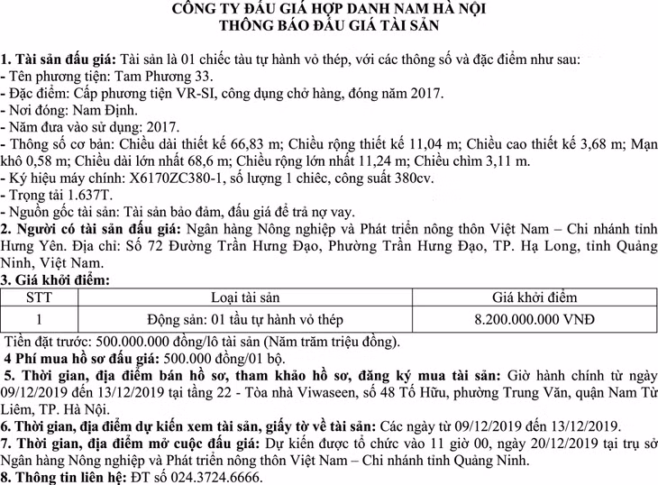 Ngày 23/12/2019, đấu giá tàu tự hành vỏ thép tại tỉnh Quảng Ninh