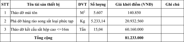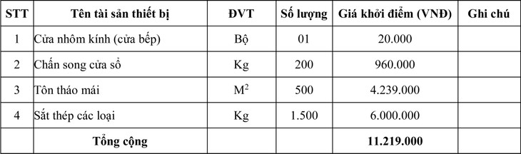 - Tài sản thứ nhất: Vật tư, vật liệu thu hồi từ phá dỡ khu nhà 1 tầng của Trung tâm Bồi dưỡng chính trị huyện Đông Anh.