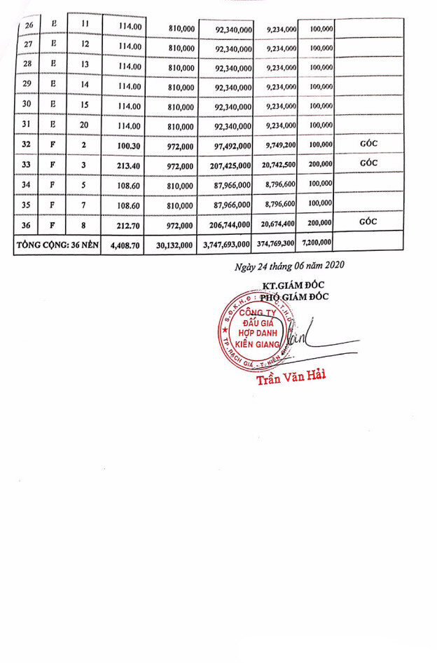 Tổ chức đấu giá: Lúc 9 giờ, ngày 23/7/2020 tại Hội trường UBND xã Kiên Bình, huyện Kiên Lương, tỉnh Kiên Giang.