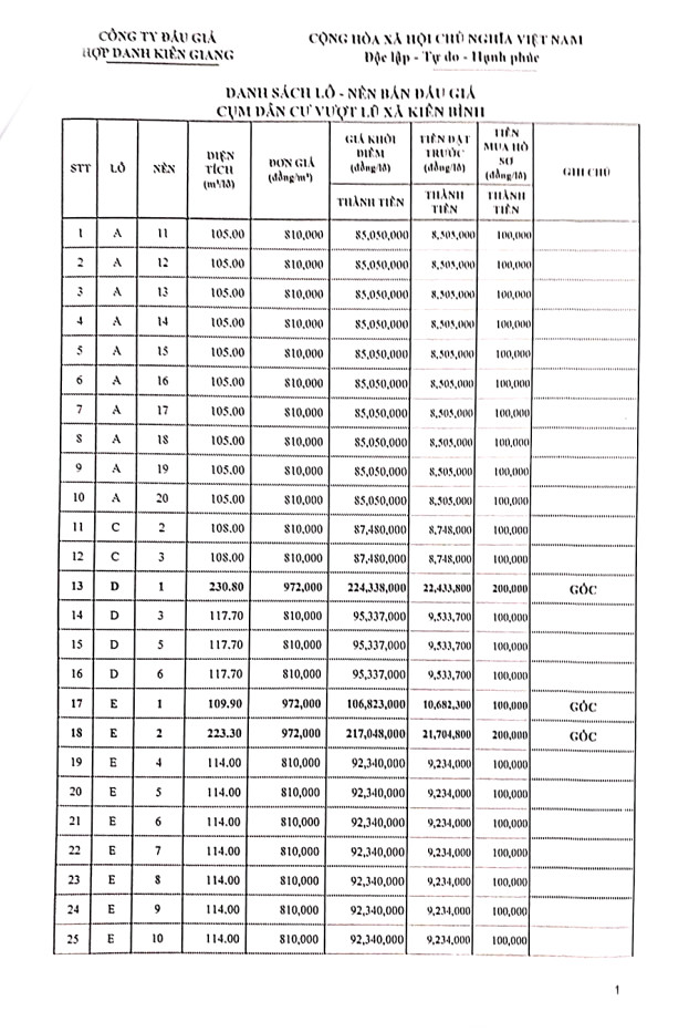 - Giá khởi điểm từ: 85.050.000- 224.338.000 đồng/nền.