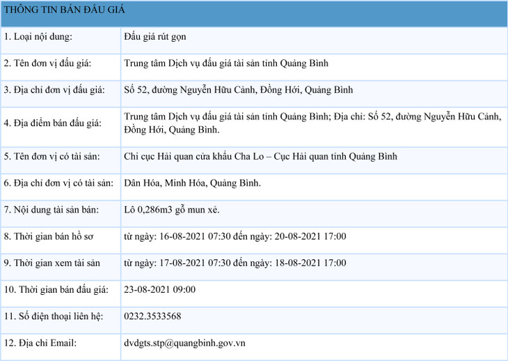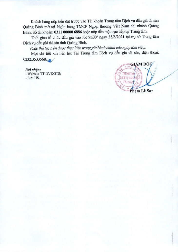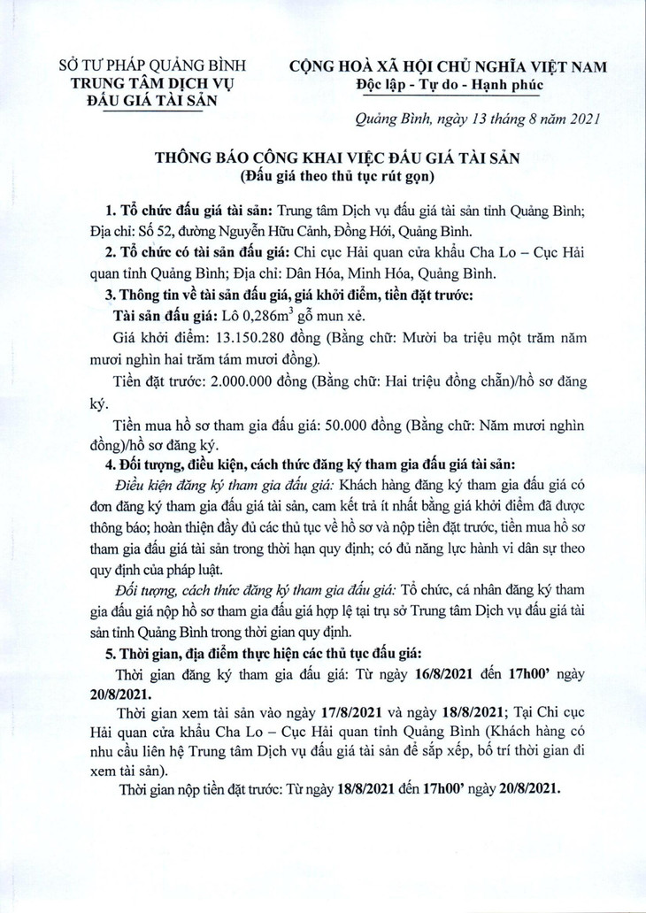 (BĐT) - Trung tâm Dịch vụ đấu giá tài sản tỉnh Quảng Bình thông báo đấu giá tài sản vào ngày 23/8/2021 do Chi cục Hải quan cửa khẩu Cha Lo – Cục Hải quan tỉnh Quảng Bình ủy quyền như sau: