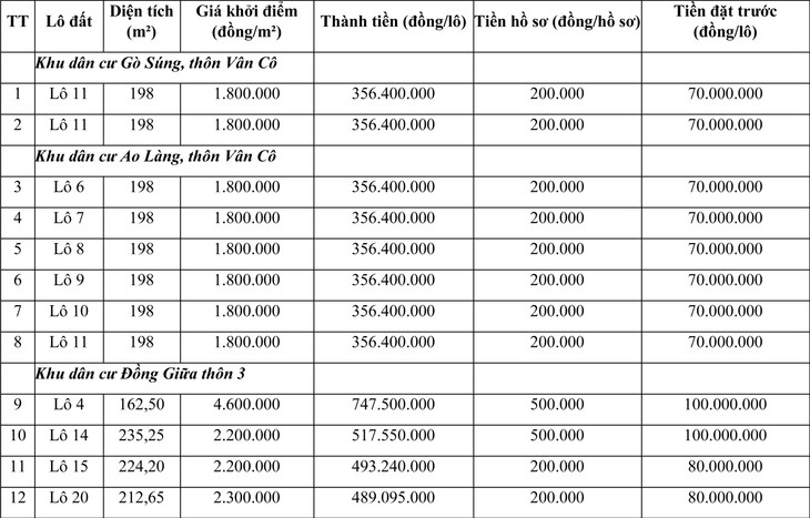 - Khu dân cư Gò Súng (lô 11, lô 12); Khu dân cư Ao Làng (lô 6 đến lô 11), giá khởi điểm 1.800.000 đồng/m2;