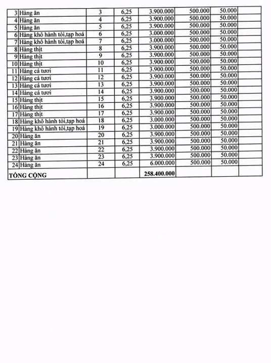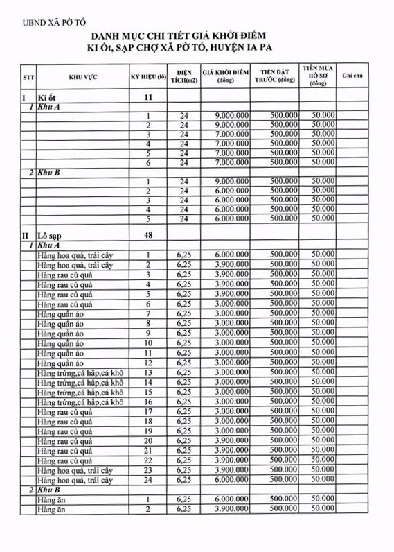 3- Tài sản đấu giá: Đấu giá cho thuê quyền sử dụng 11 ki ốt, 48 sạp bán hàng chợ Pờ Tó. Tổng giá khởi điểm: 258.400.000 đồng (Hai trăm năm mươi tám triệu bốn trăm ngàn đồng).
