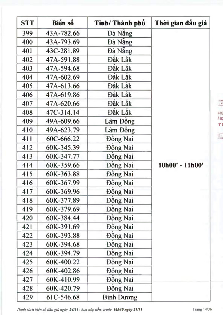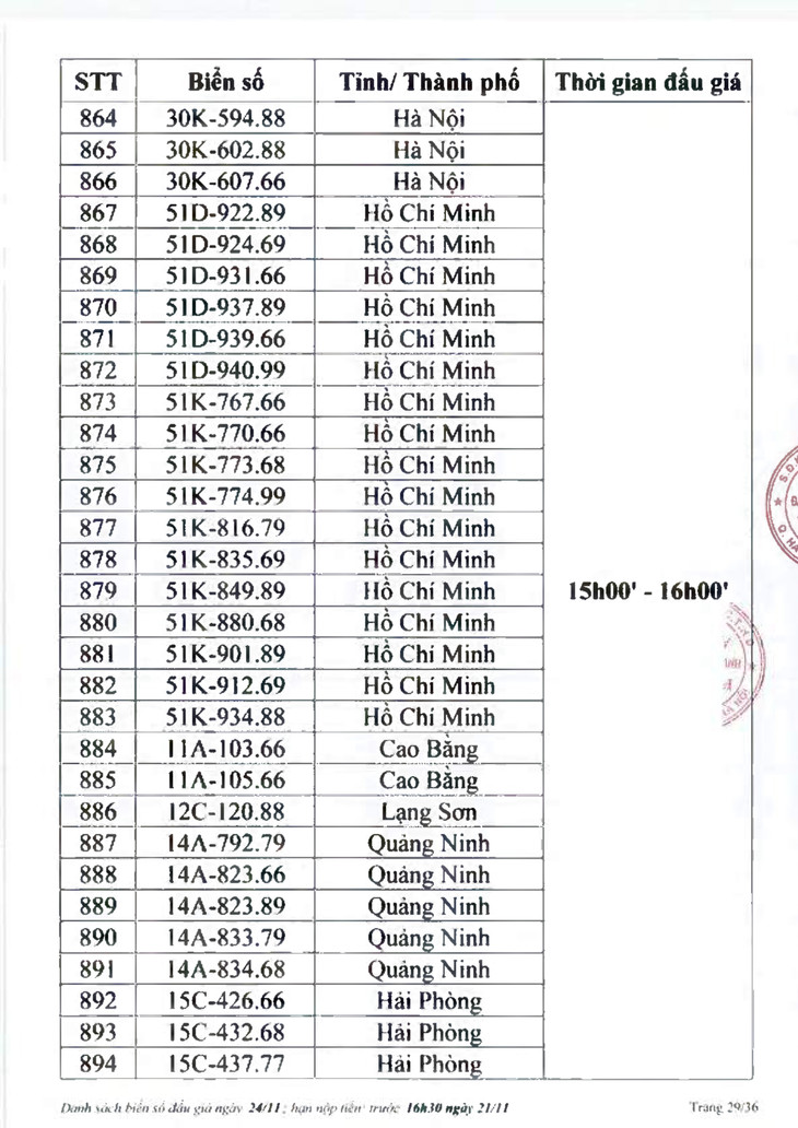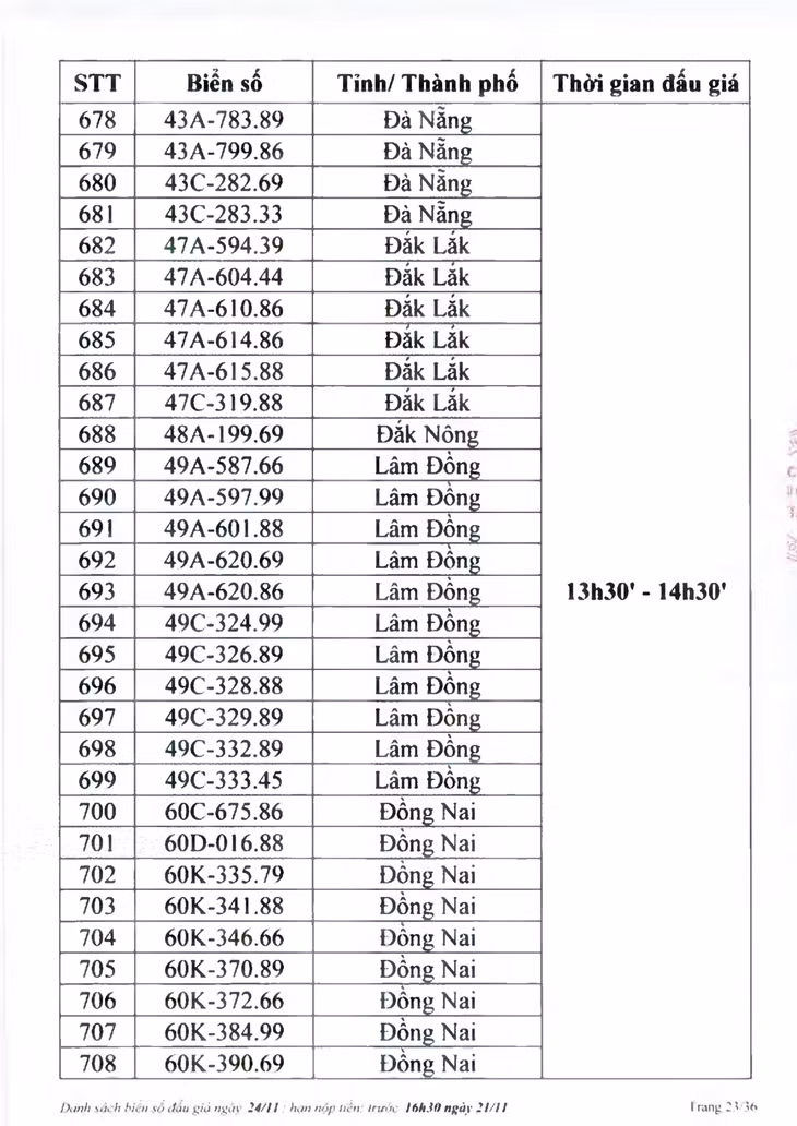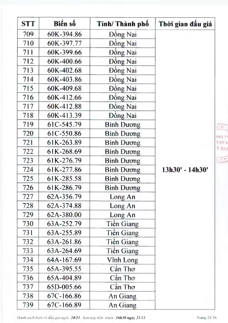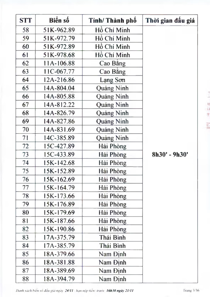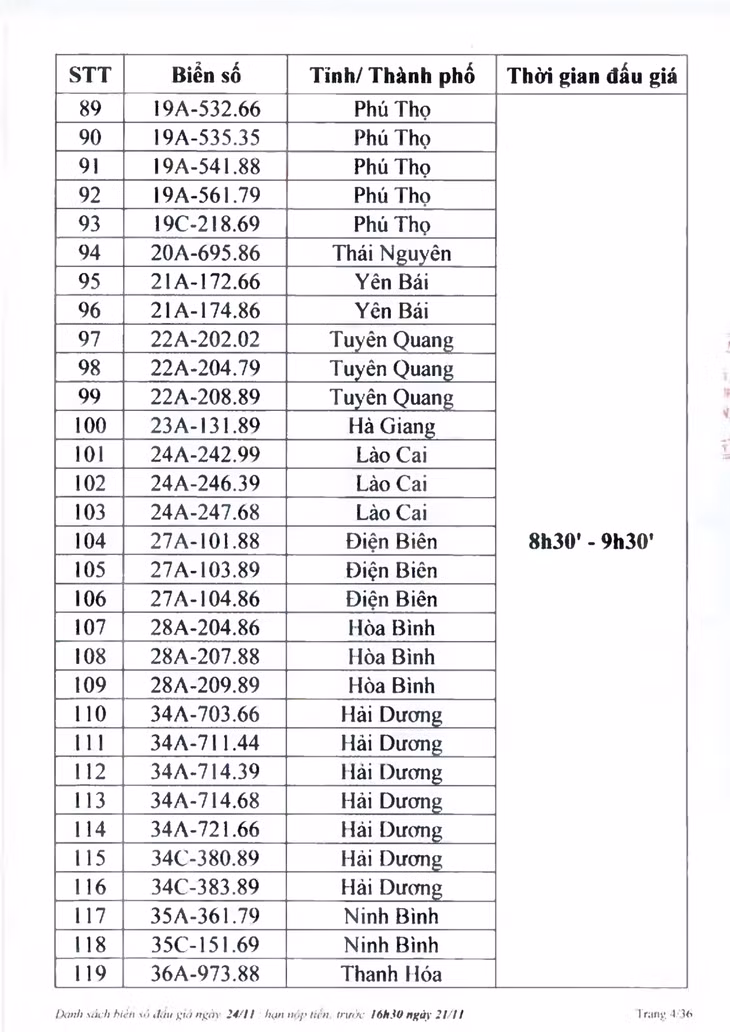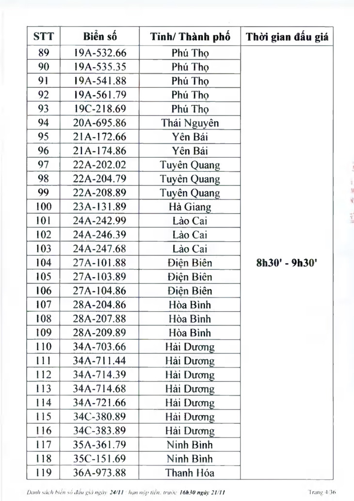 Sau đây là danh sách biển số ô tô và các phiên đấu giá trực tuyến chiều ngày 24/11: