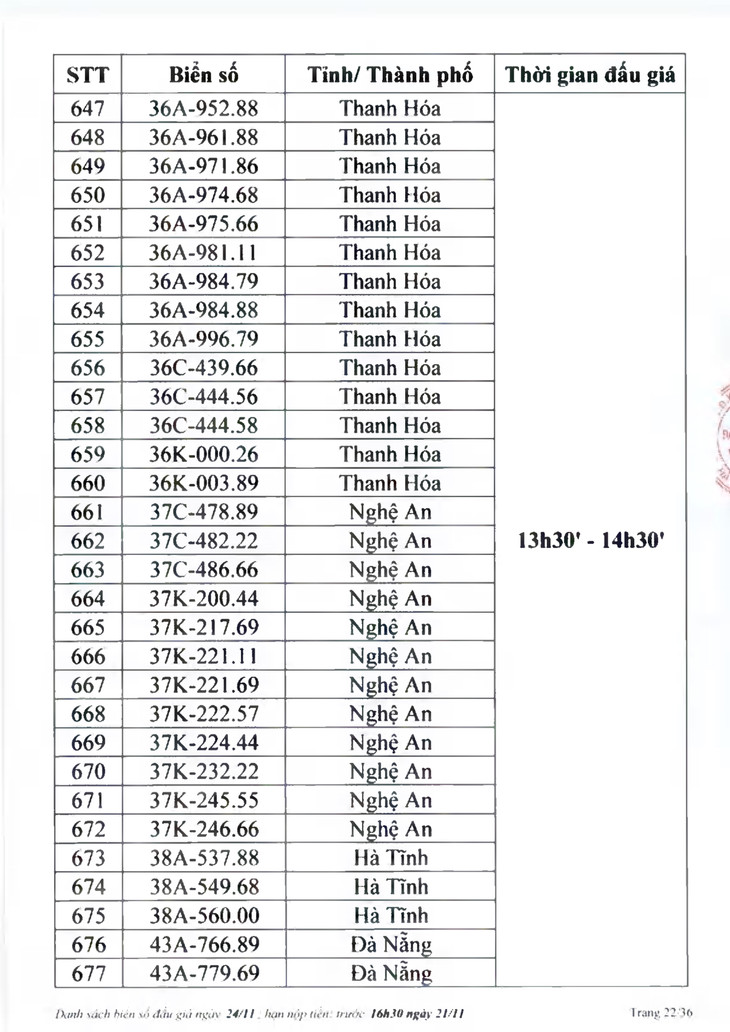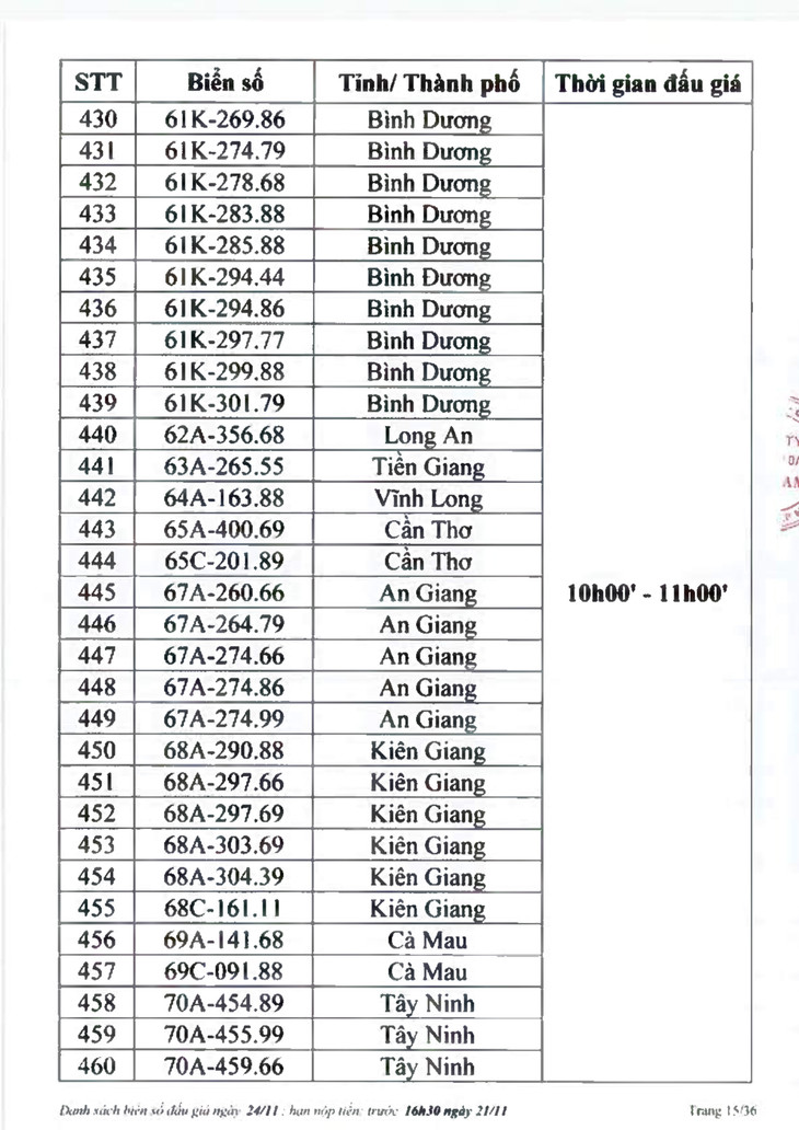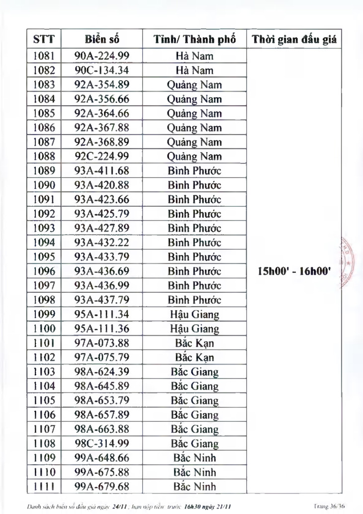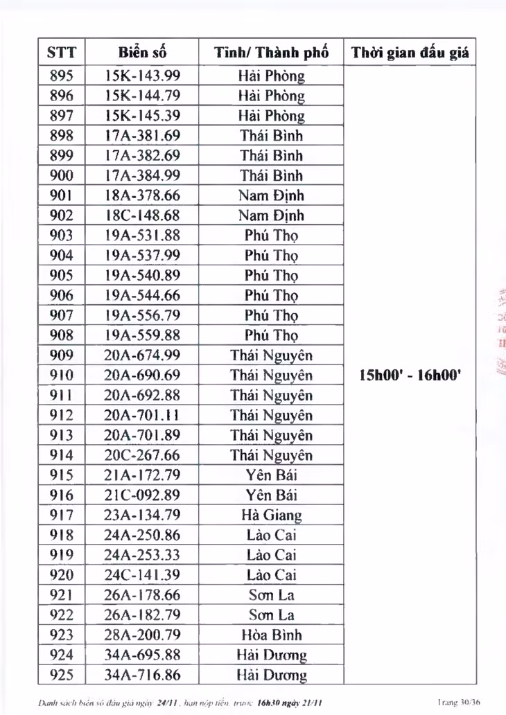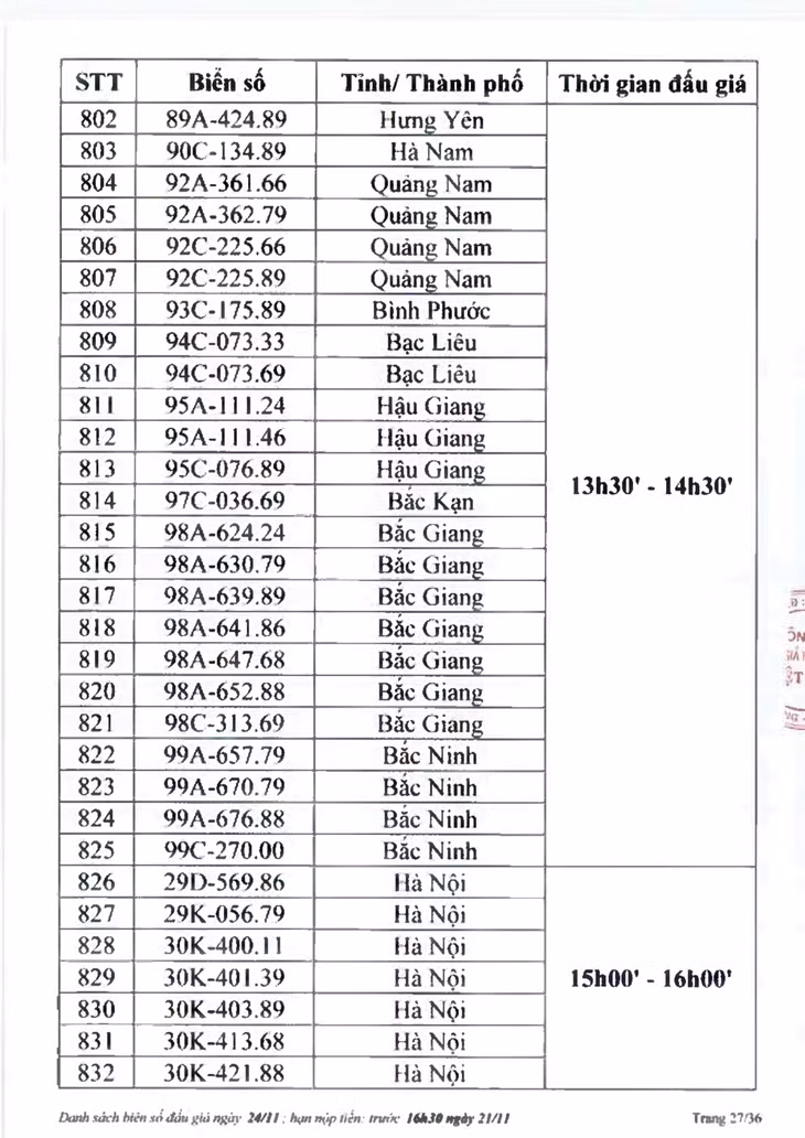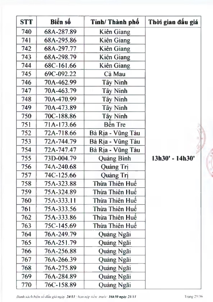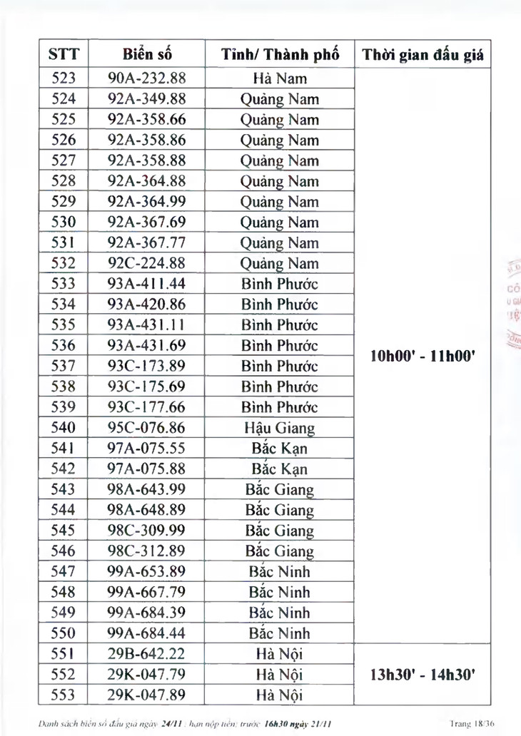 Sau đây là danh sách biển số ô tô và các phiên đấu giá trực tuyến chiều ngày 24/11: