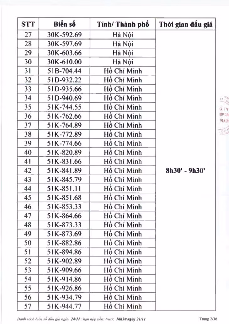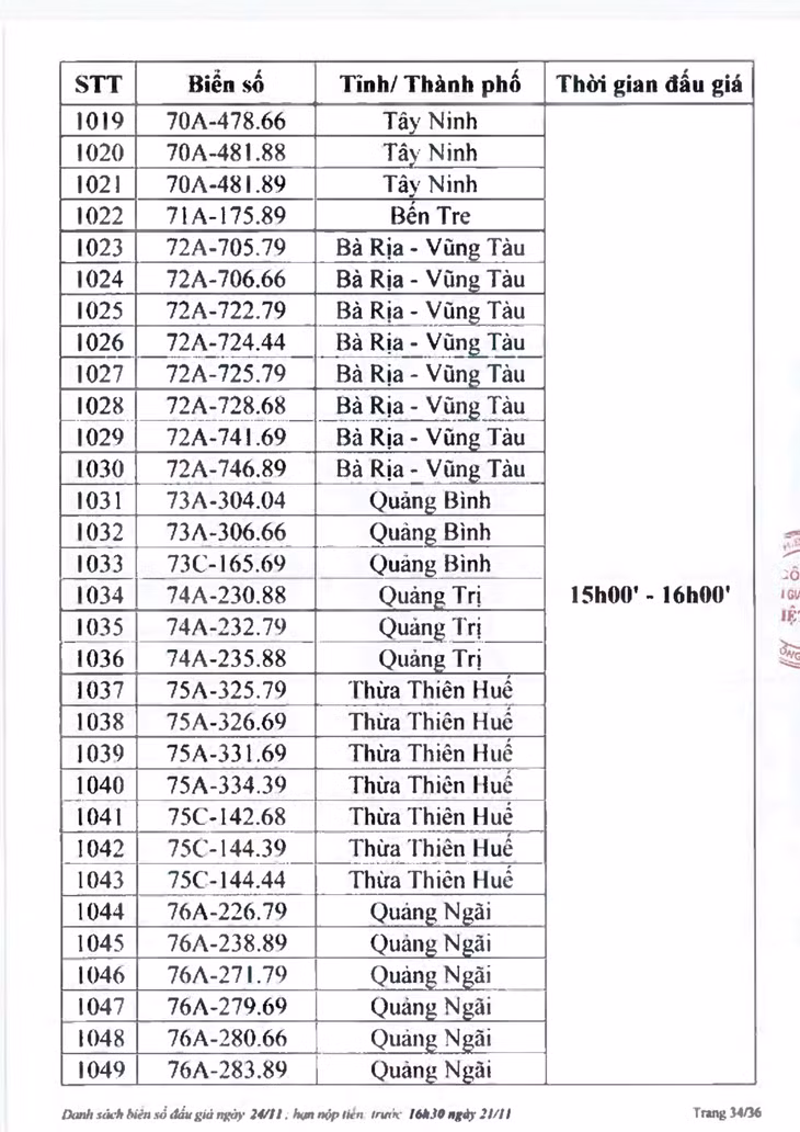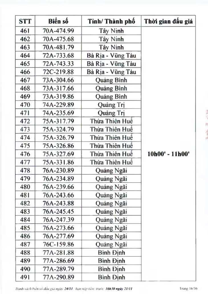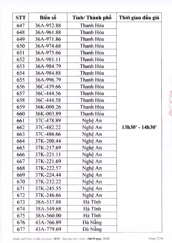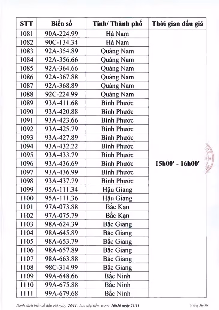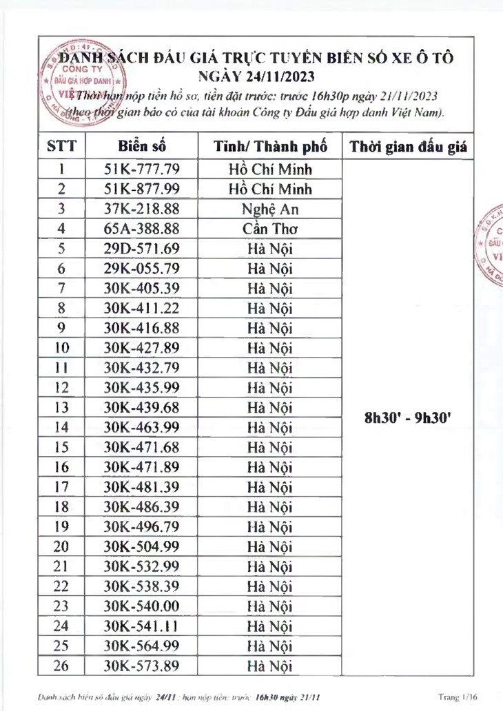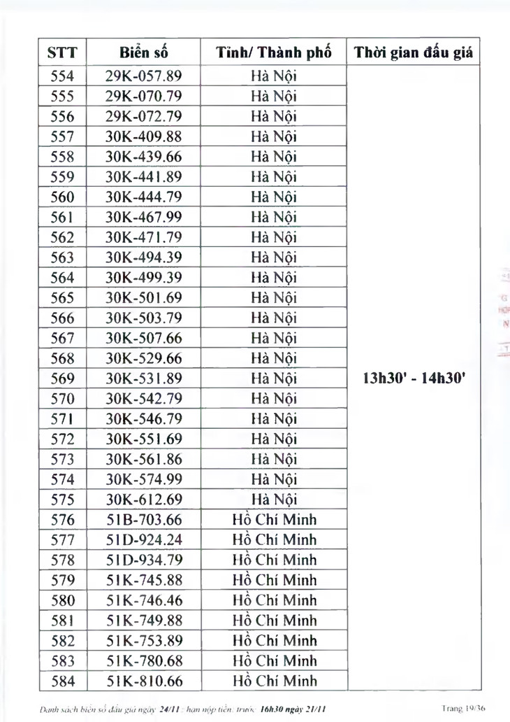 Sau đây là danh sách biển số ô tô và các phiên đấu giá trực tuyến chiều ngày 24/11: