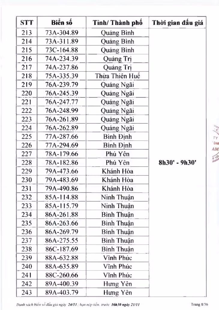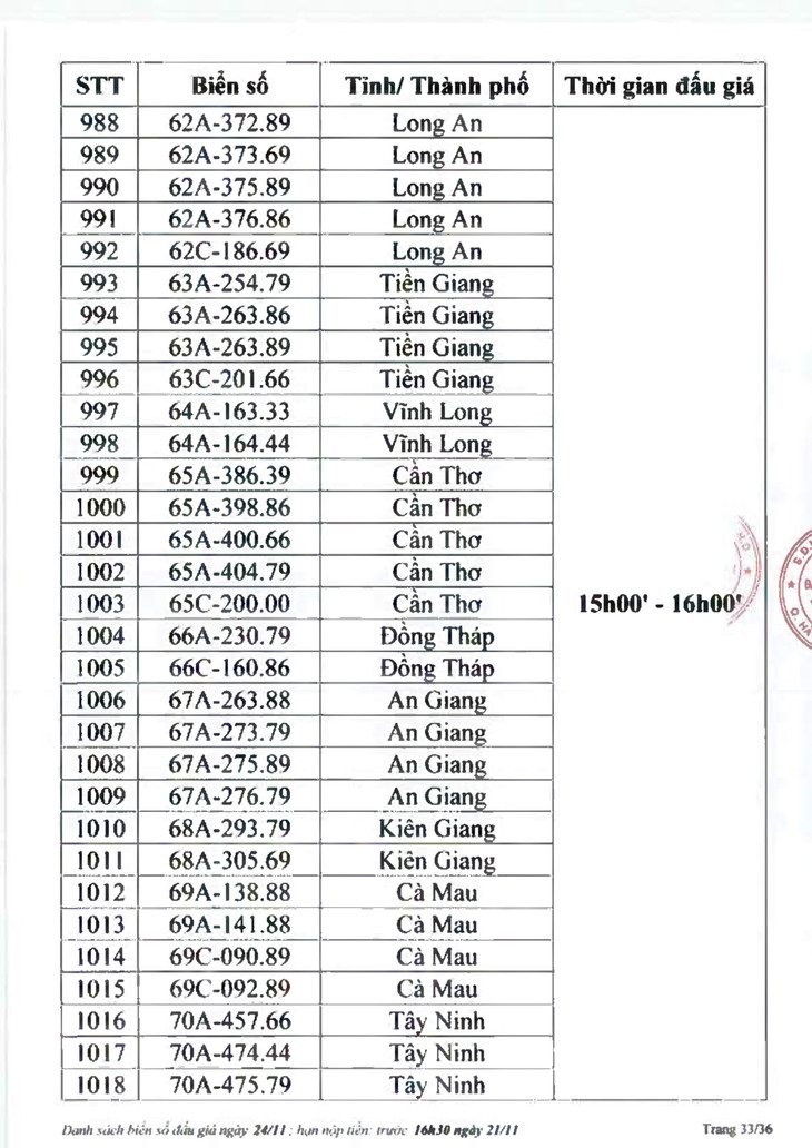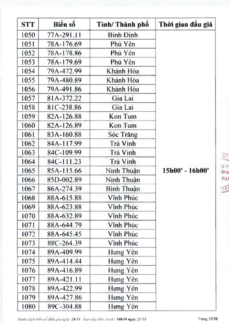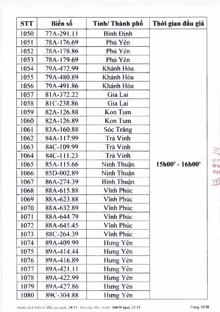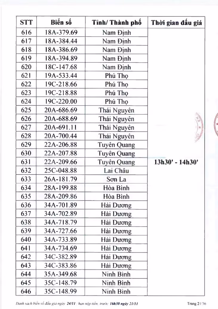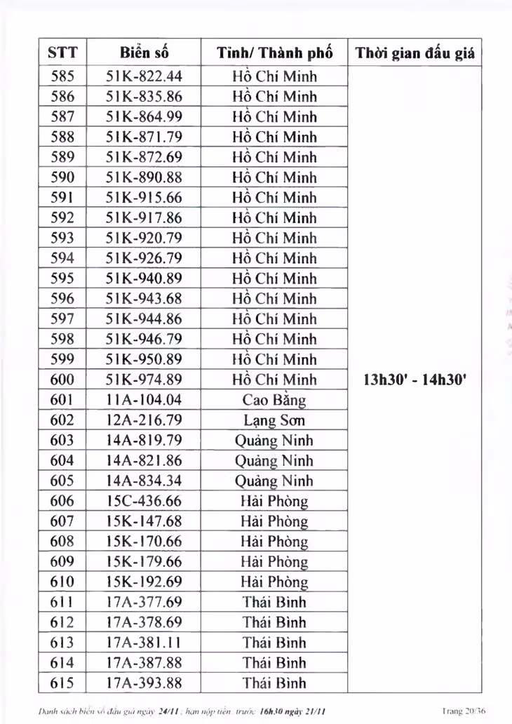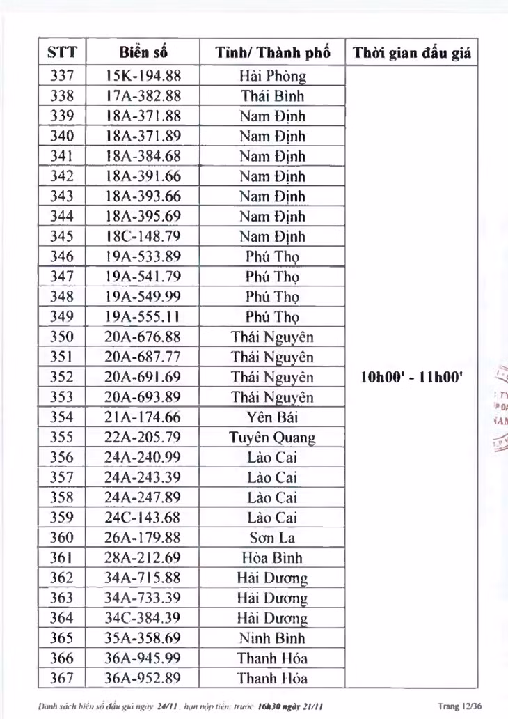 Sau đây là danh sách biển số ô tô và các phiên đấu giá trực tuyến chiều ngày 24/11: