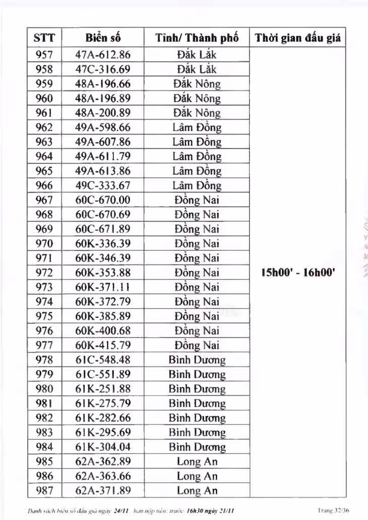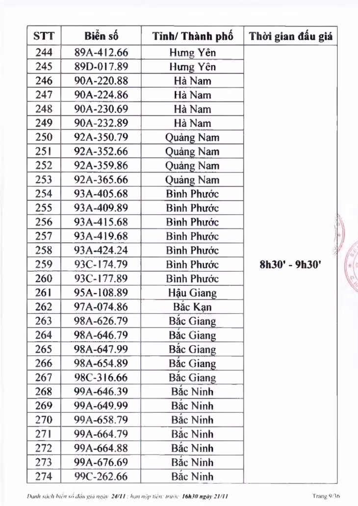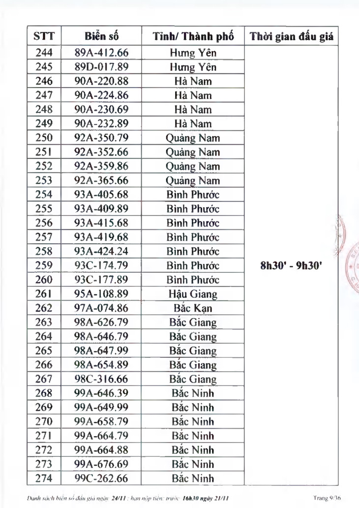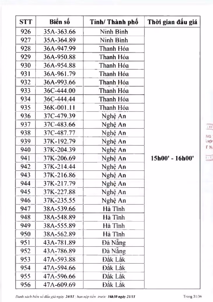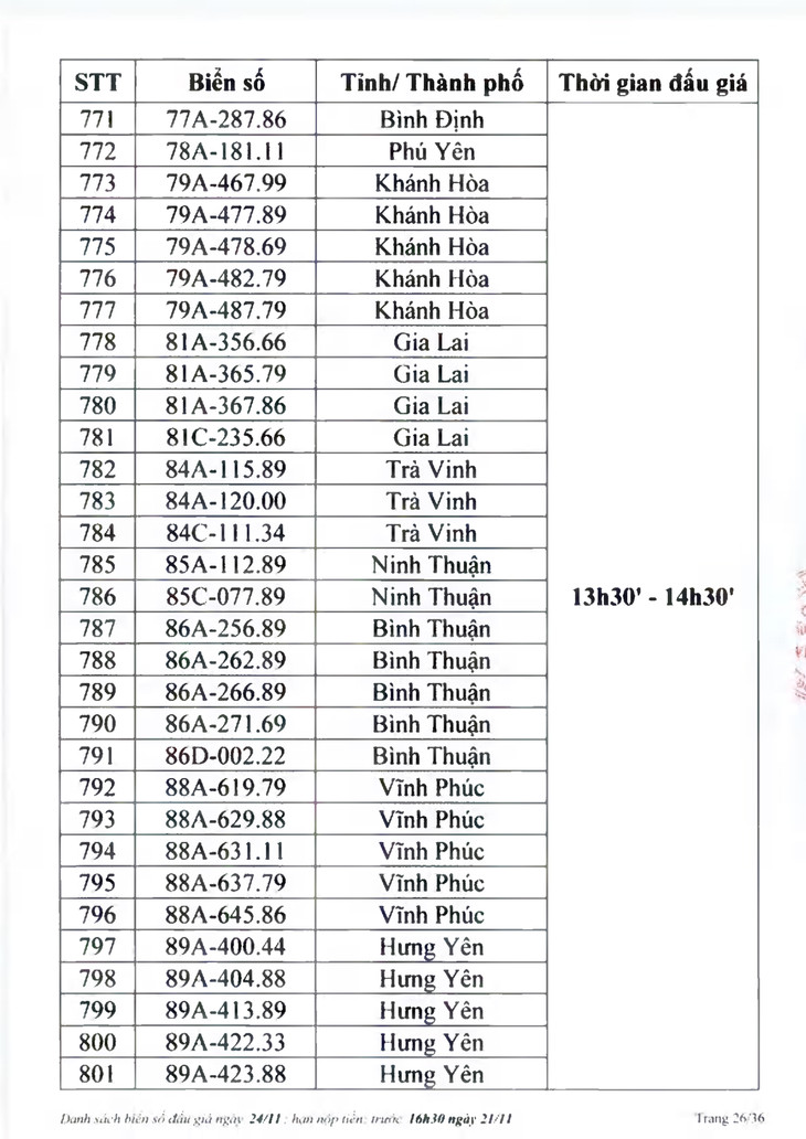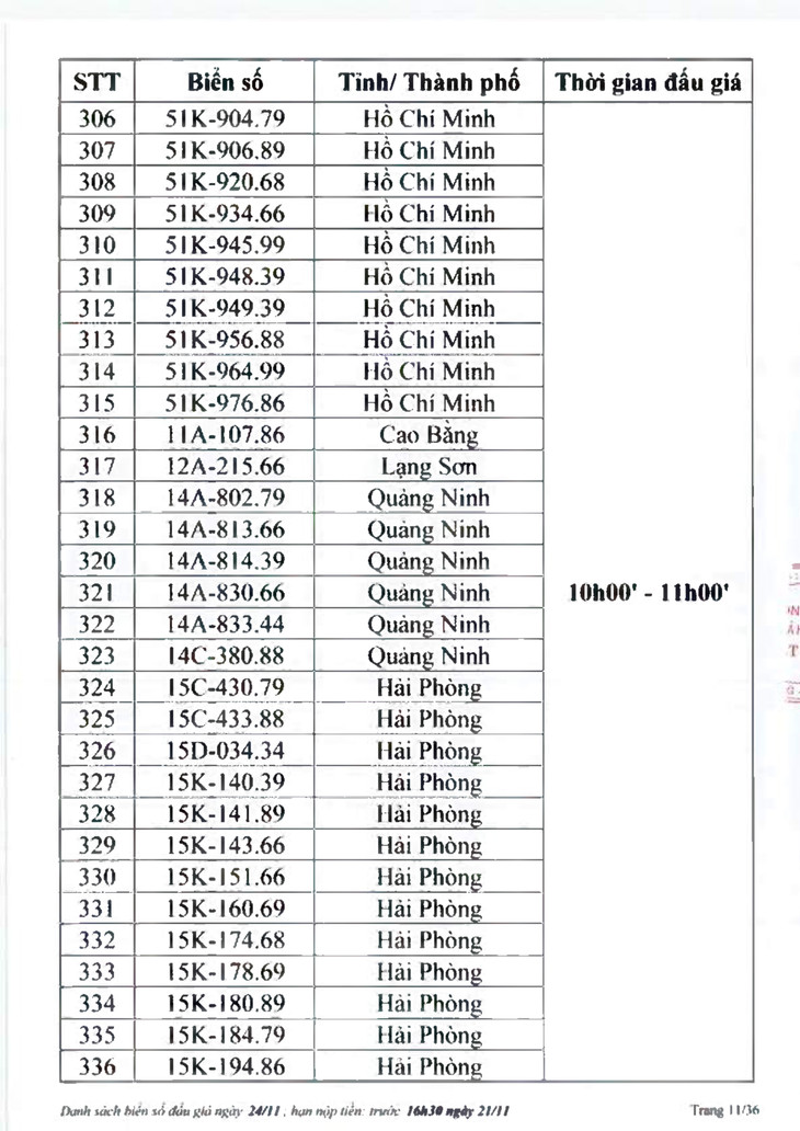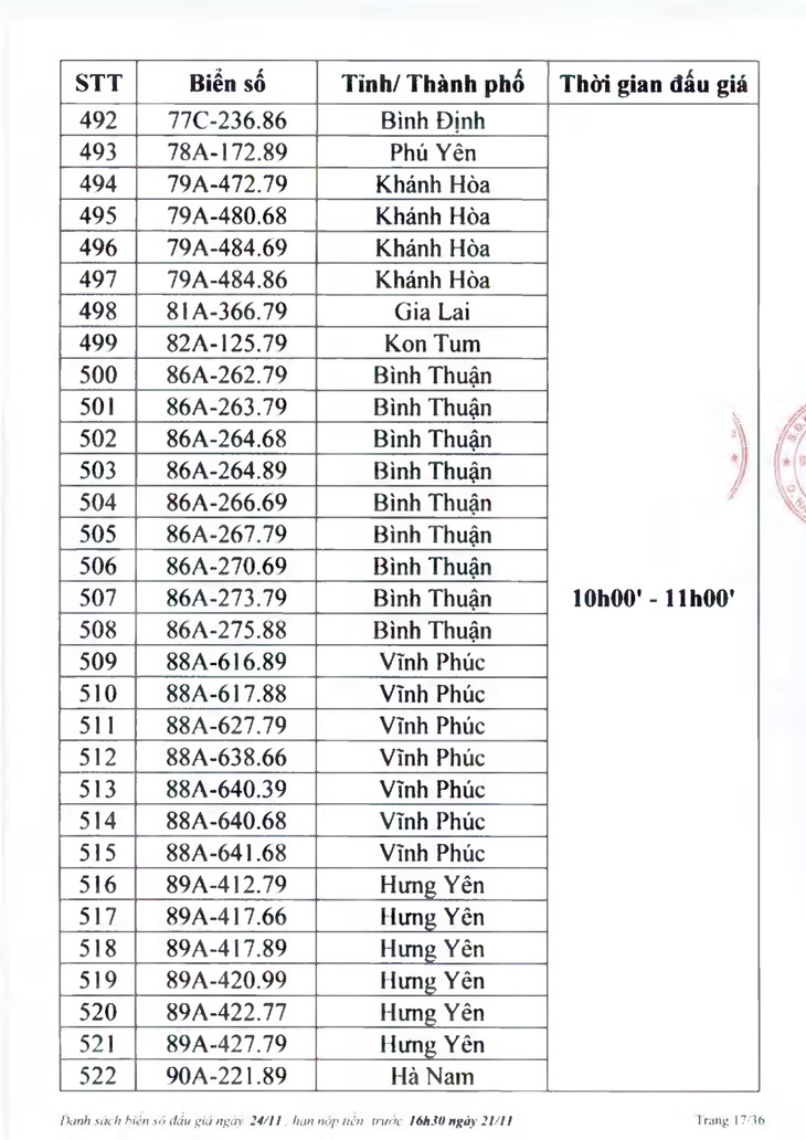 Sau đây là danh sách biển số ô tô và các phiên đấu giá trực tuyến chiều ngày 24/11: