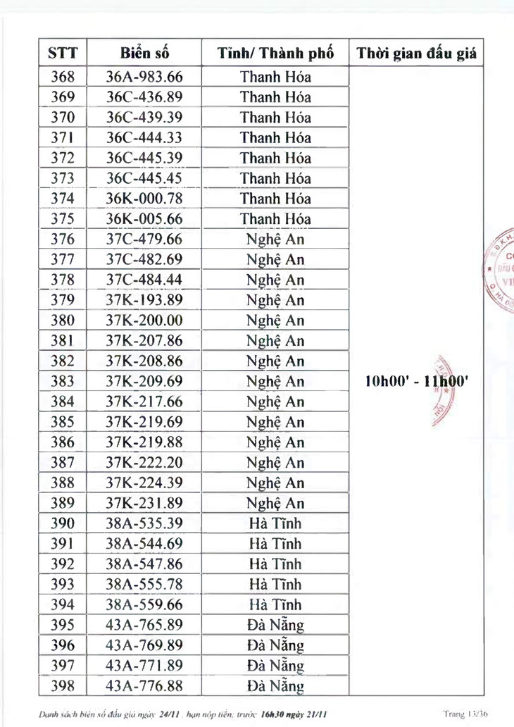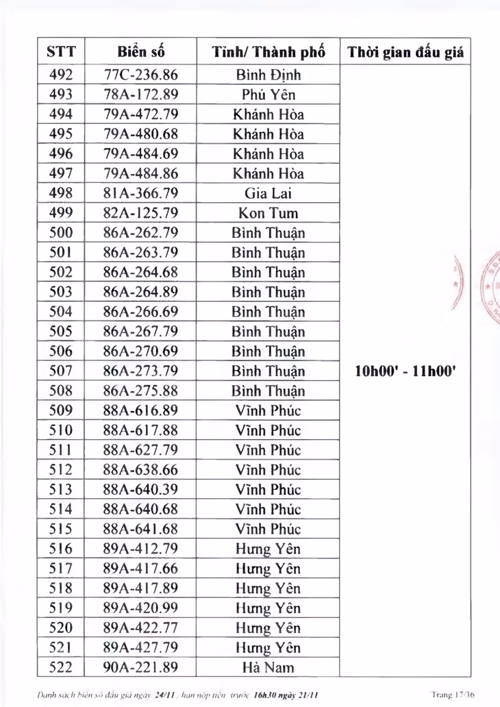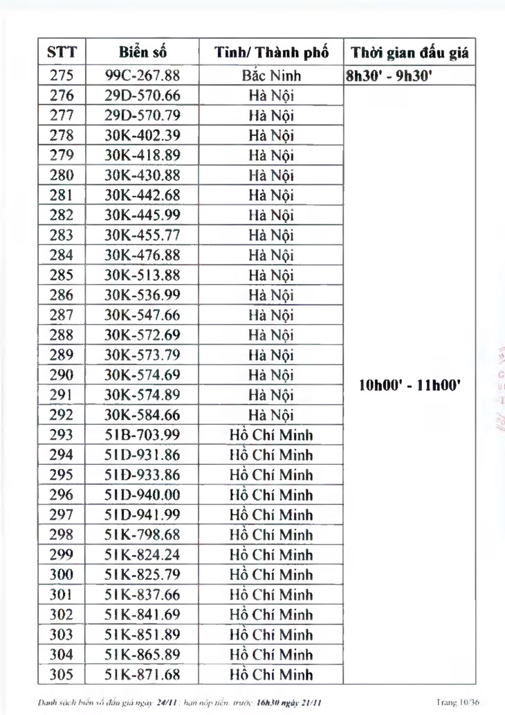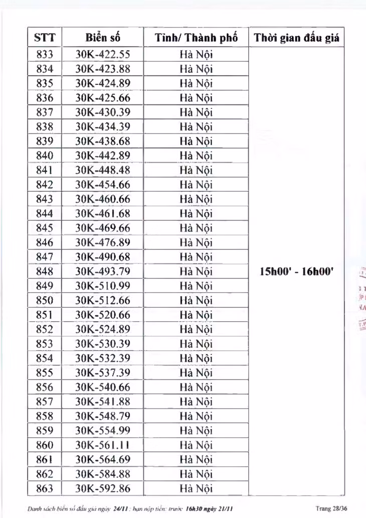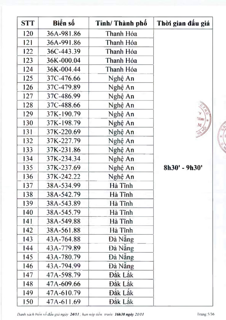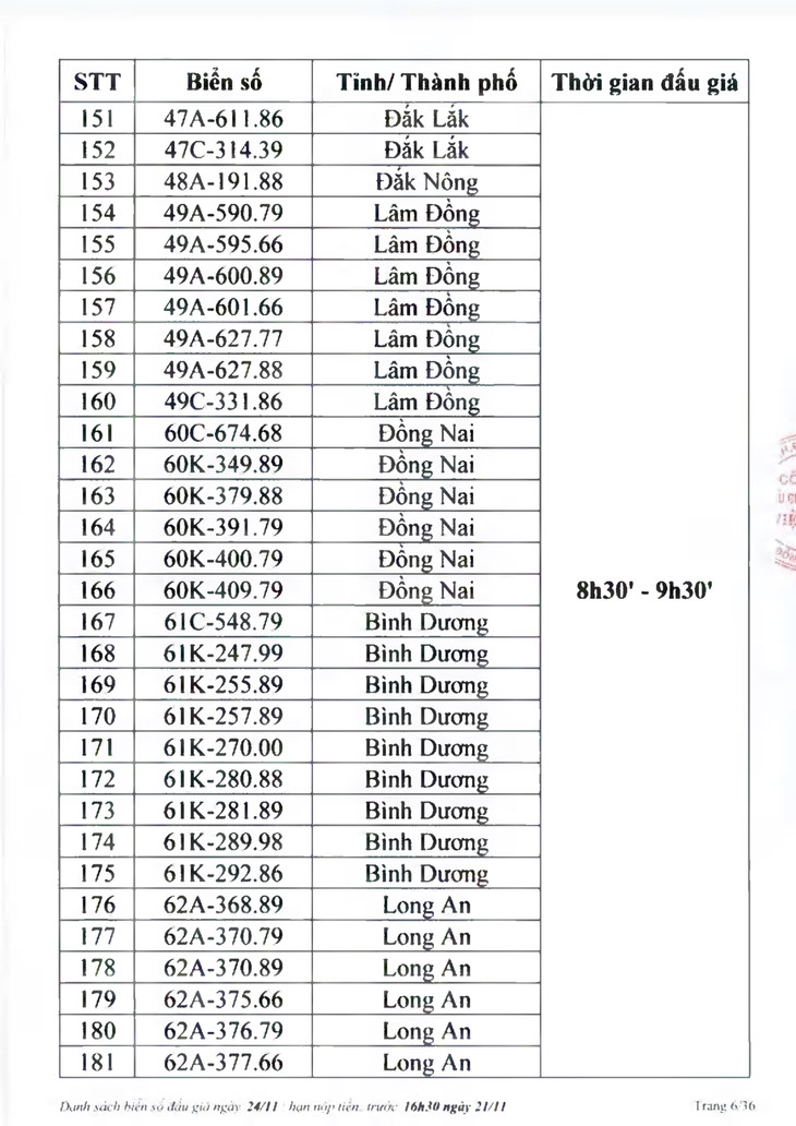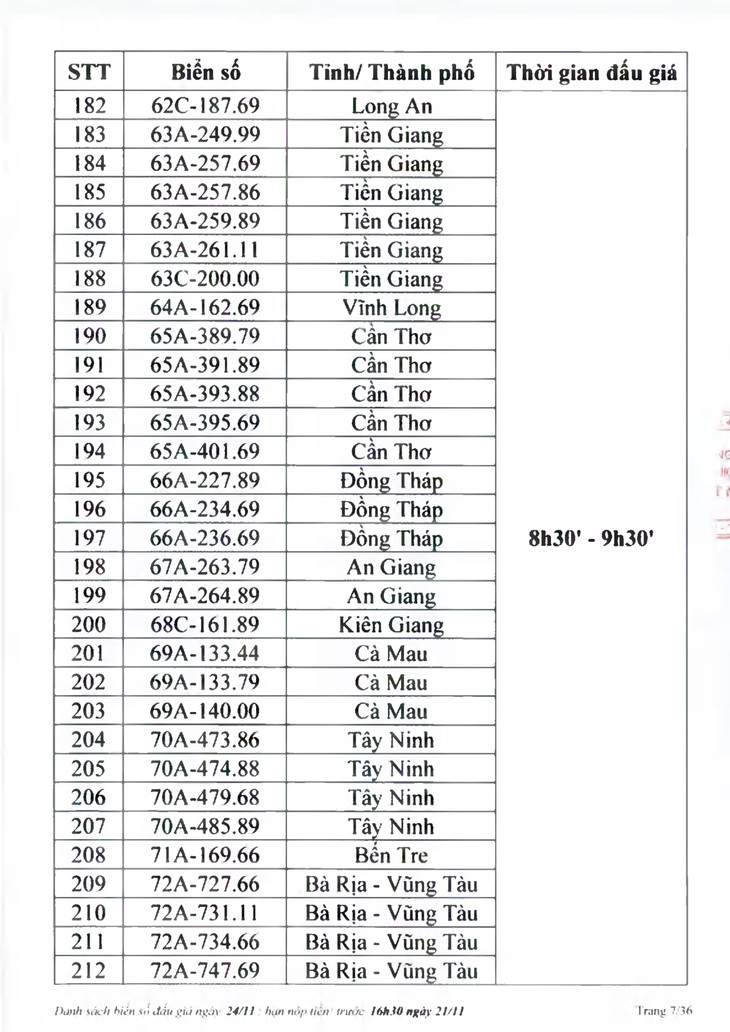 Sau đây là danh sách biển số ô tô và các phiên đấu giá trực tuyến chiều ngày 24/11: