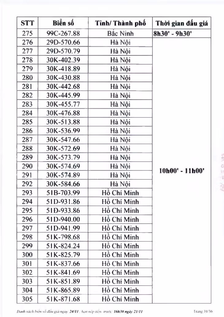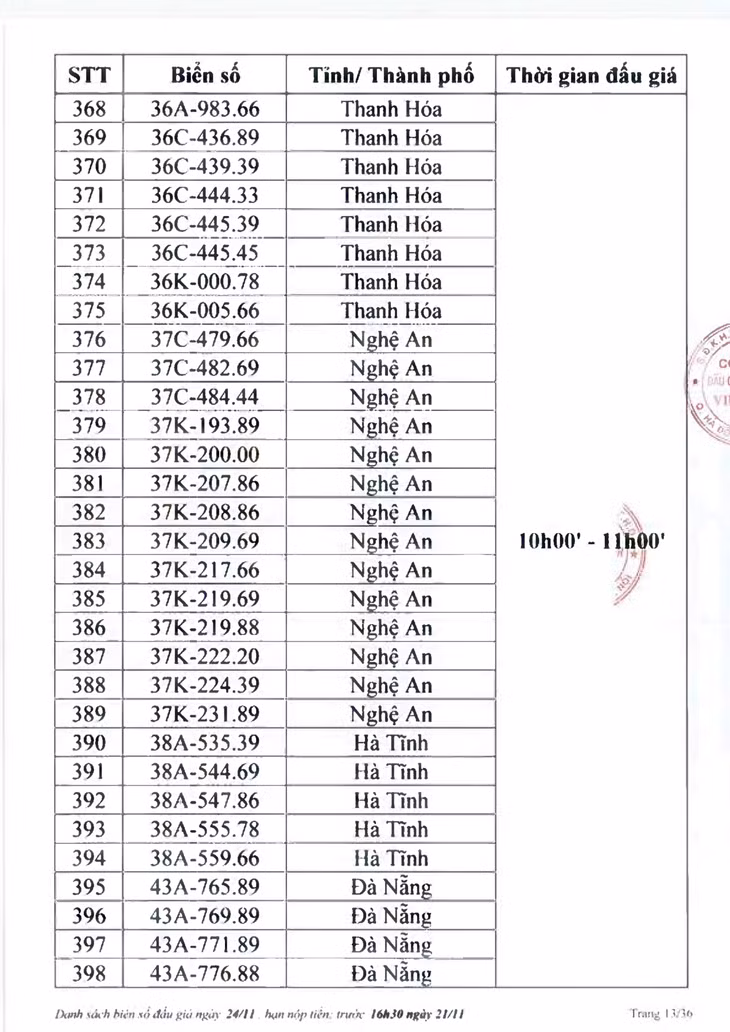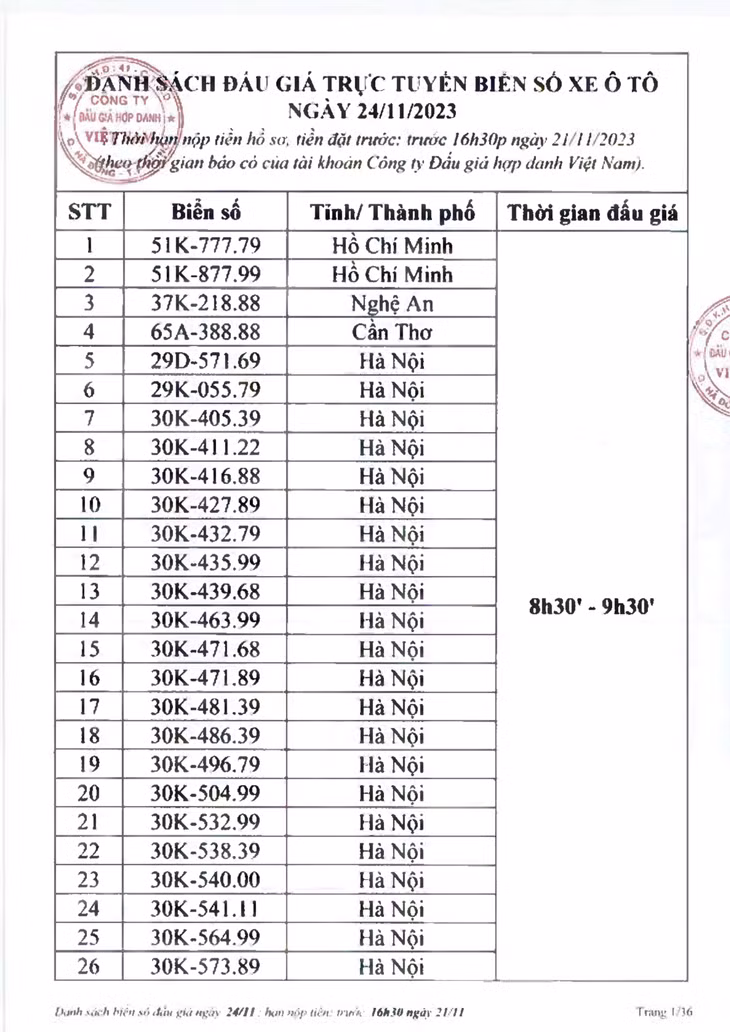 Công ty Đấu giá hợp danh Việt Nam (VPA) thông báo danh sách đấu giá trực tuyến biển số xe ô tô ngày 24/11. Theo đó, sẽ có 1.111 biển số lên sàn đấu giá vào 4 khung giờ là 8h30 - 9h30; 10h00 - 11h00; 13h30 - 14h30 và 15h - 16h.