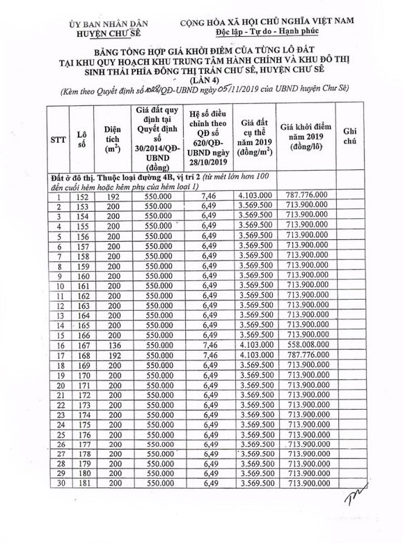 3- Tài sản đấu giá: Đấu giá quyền sử dụng đất tại khu quy hoạch Khu Trung tâm hành chính và Khu đô thị sinh thái phía Đông thị trấn Chư Sê (lần 4); Chi tiết theo Phụ lục.