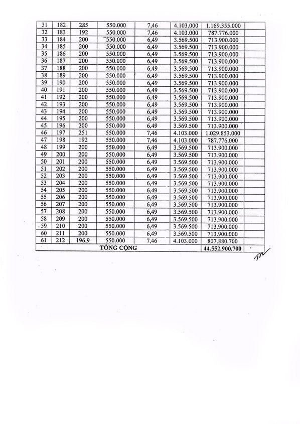 - Tổng giá khởi điểm: 44.552.900.700 đồng (Bốn mươi bốn tỷ, năm trăm năm mươi hai triệu, chín trăm ngàn, bảy trăm đồng).
