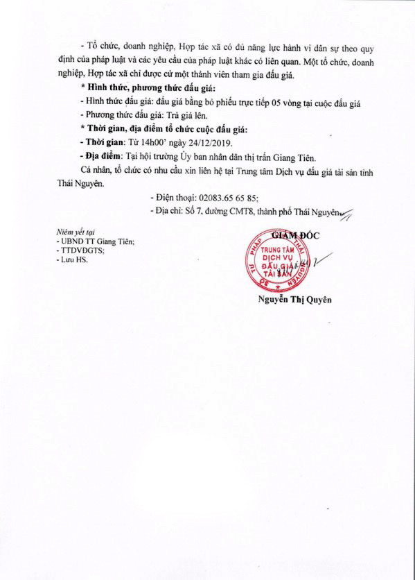 (BĐT) - Trung tâm dịch vụ đấu giá tỉnh Thái Nguyên thông báo bán đấu giá tài sản vào ngày 24/12/2019 do UBND huyện Phú Lương ủy quyền như sau: