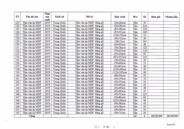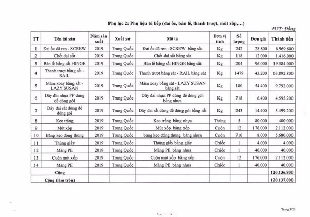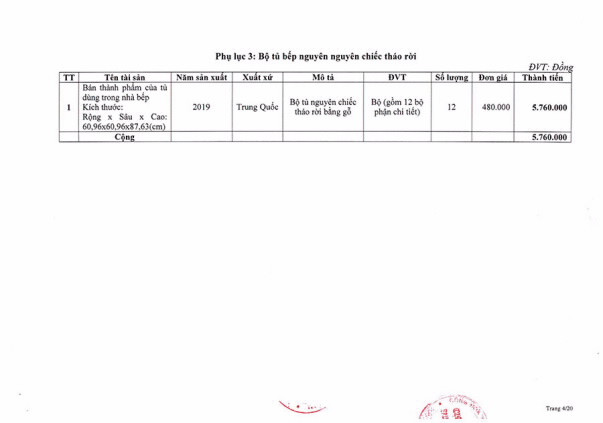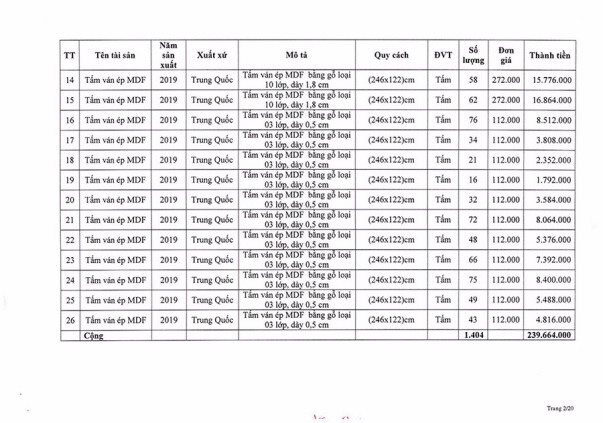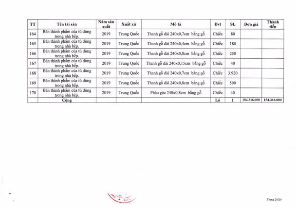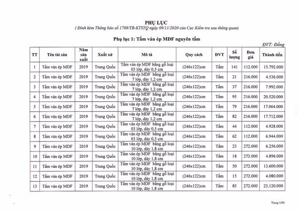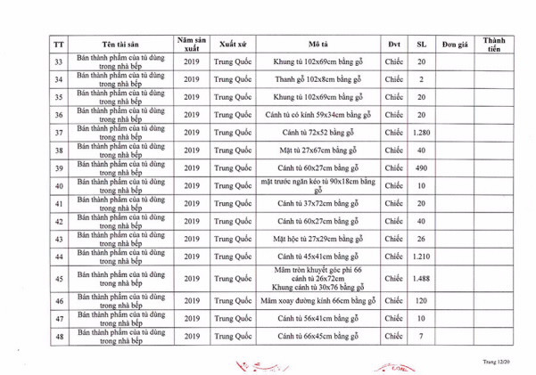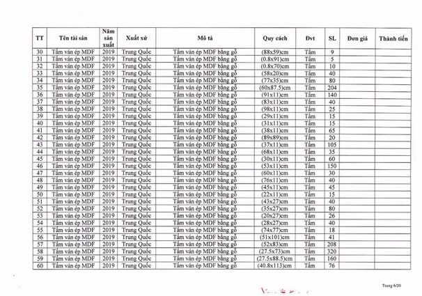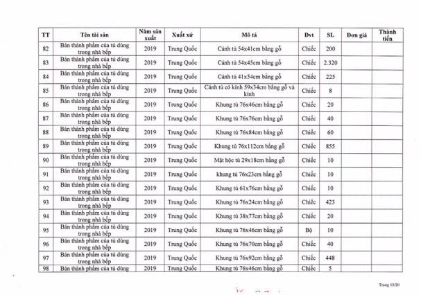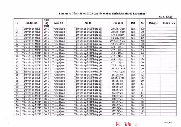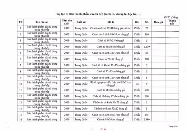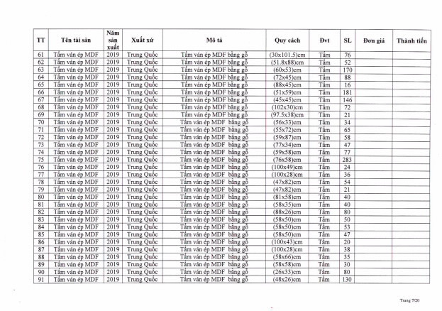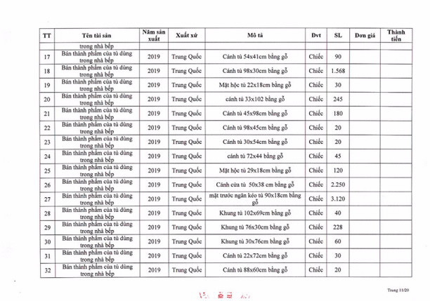 Tài sản đấu giá: 01 lô hàng bán thành phẩm của tủ dùng trong nhà bếp, tấm ván MDF, đai ốc đã ren, chốt đai sắt, bản lề bằng sắt, thanh trượt bằng sắt, mâm xoay bằng sắt, dây đai nhựa PP, dây đai sắt, keo trắng, mút xốp, băng keo, thùng giấy, màng PE (Theo danh sách đính kèm).