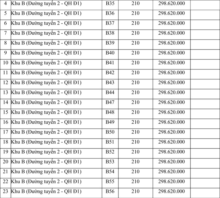 4. Tiền đặt trước: 10% giá khởi điểm của mỗi lô đất.