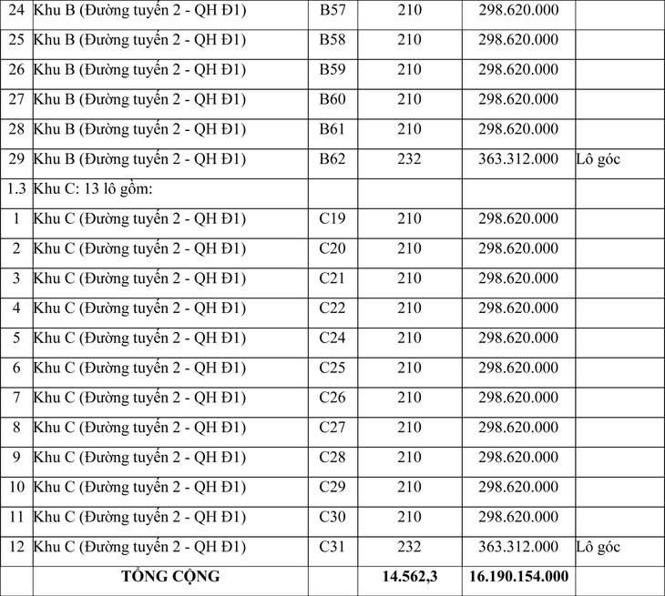 - Tổng diện tích đất bán đấu giá: 14.562,3 m2