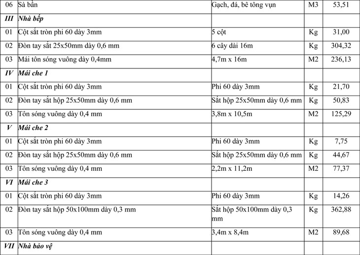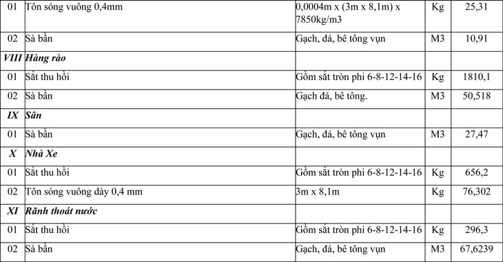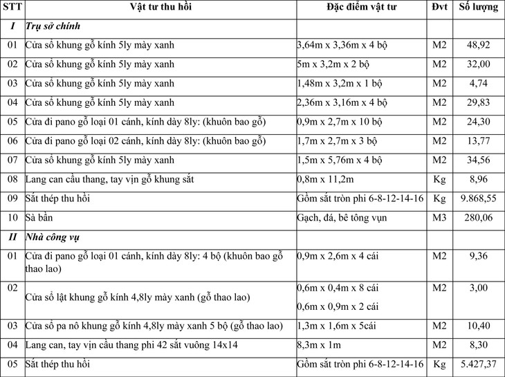 DANH MỤC THANH LÝ VẬT TƯ THU HỒI TỪ VIỆC THÁO DỠ CÔNG TRÌNH