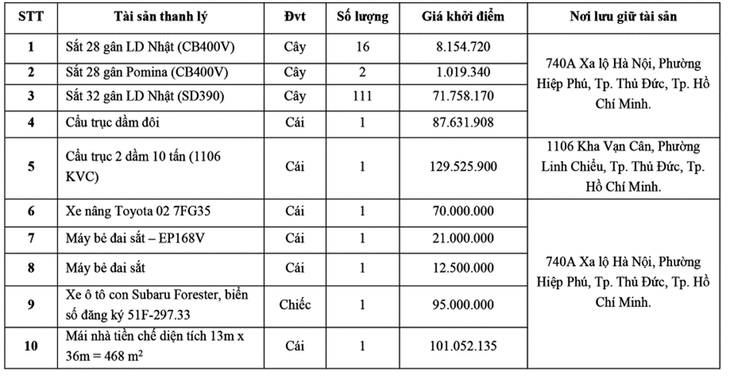 - Tài sản đấu giá: Lô tài sản thanh lý bao gồm vật kiến trúc, tài sản cố định, hàng hóa và công cụ dụng cụ của Công ty cổ phần Thương mại Xuất nhập khẩu Thủ Đức, cụ thể như sau: