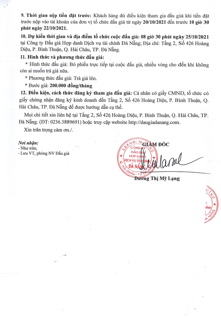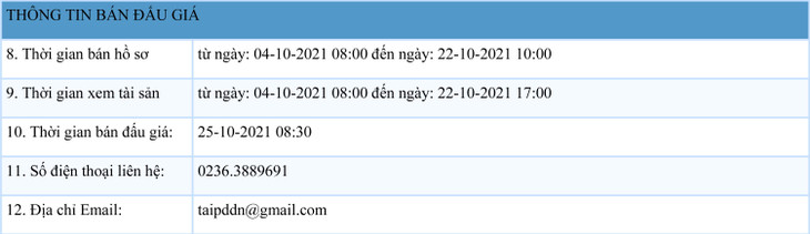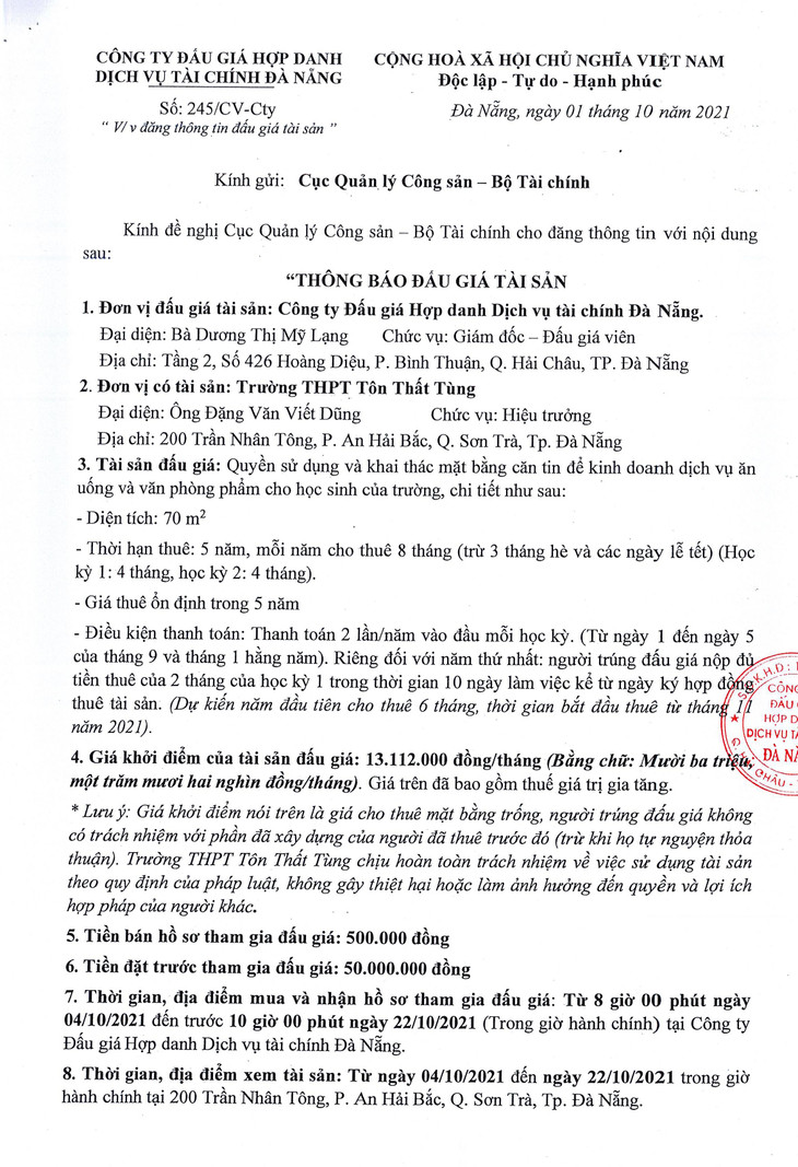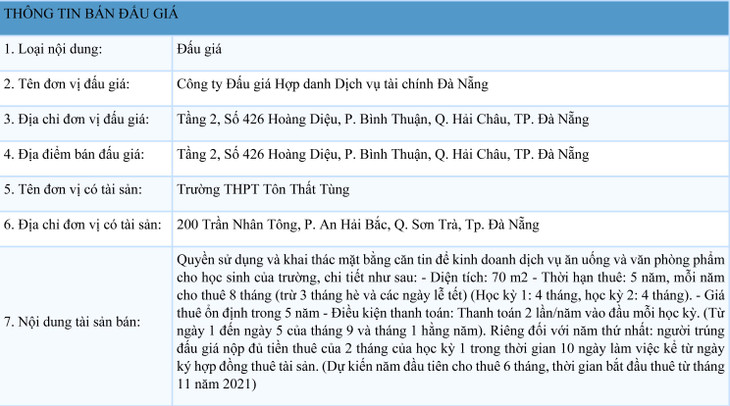 (BĐT) - Công ty Đấu giá hợp danh Dịch vụ tài chính Đà Nẵng thông báo đấu giá tài sản vào ngày 25/10/2021 do Trường THPT Tôn Thất Tùng ủy quyền như sau: